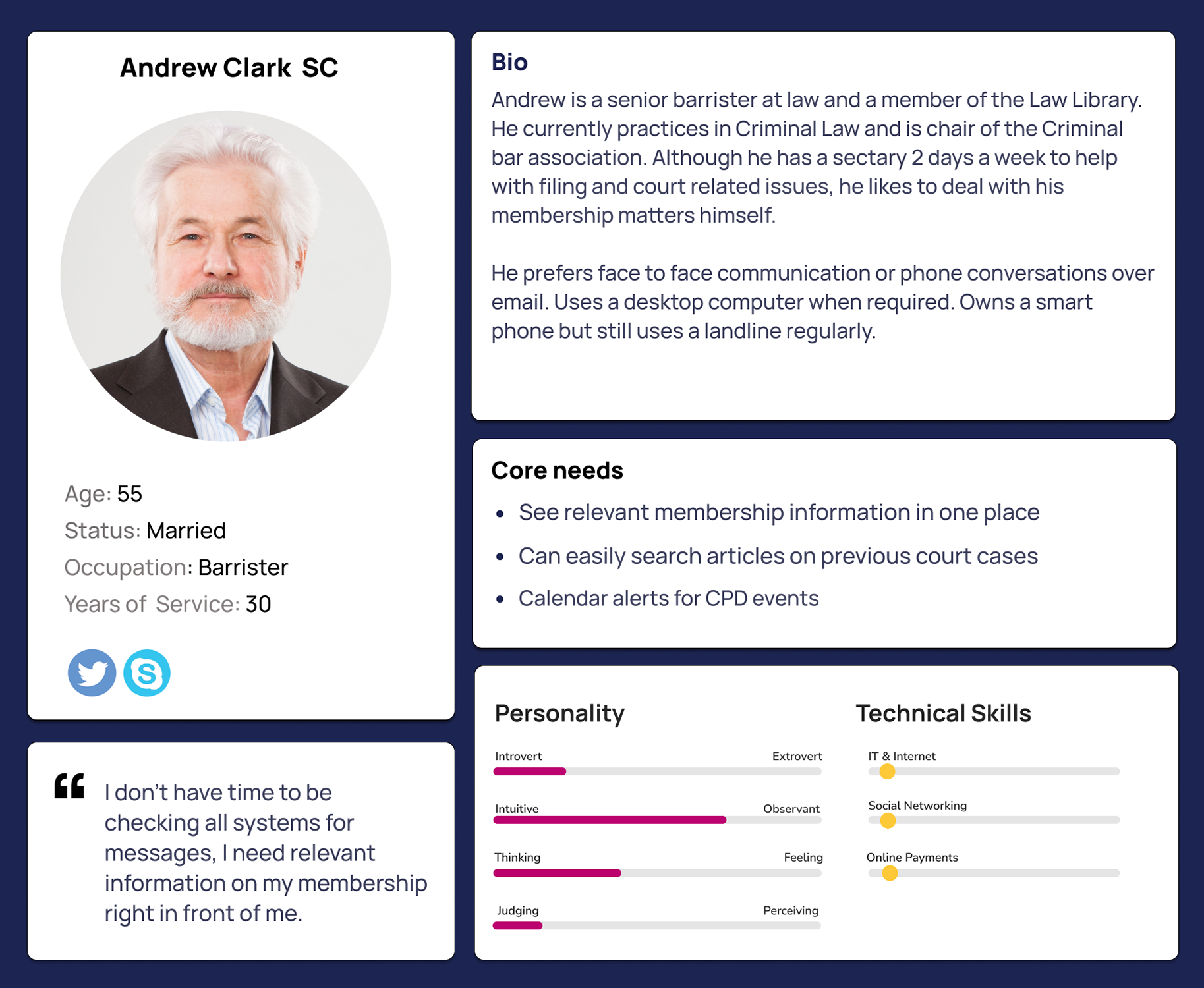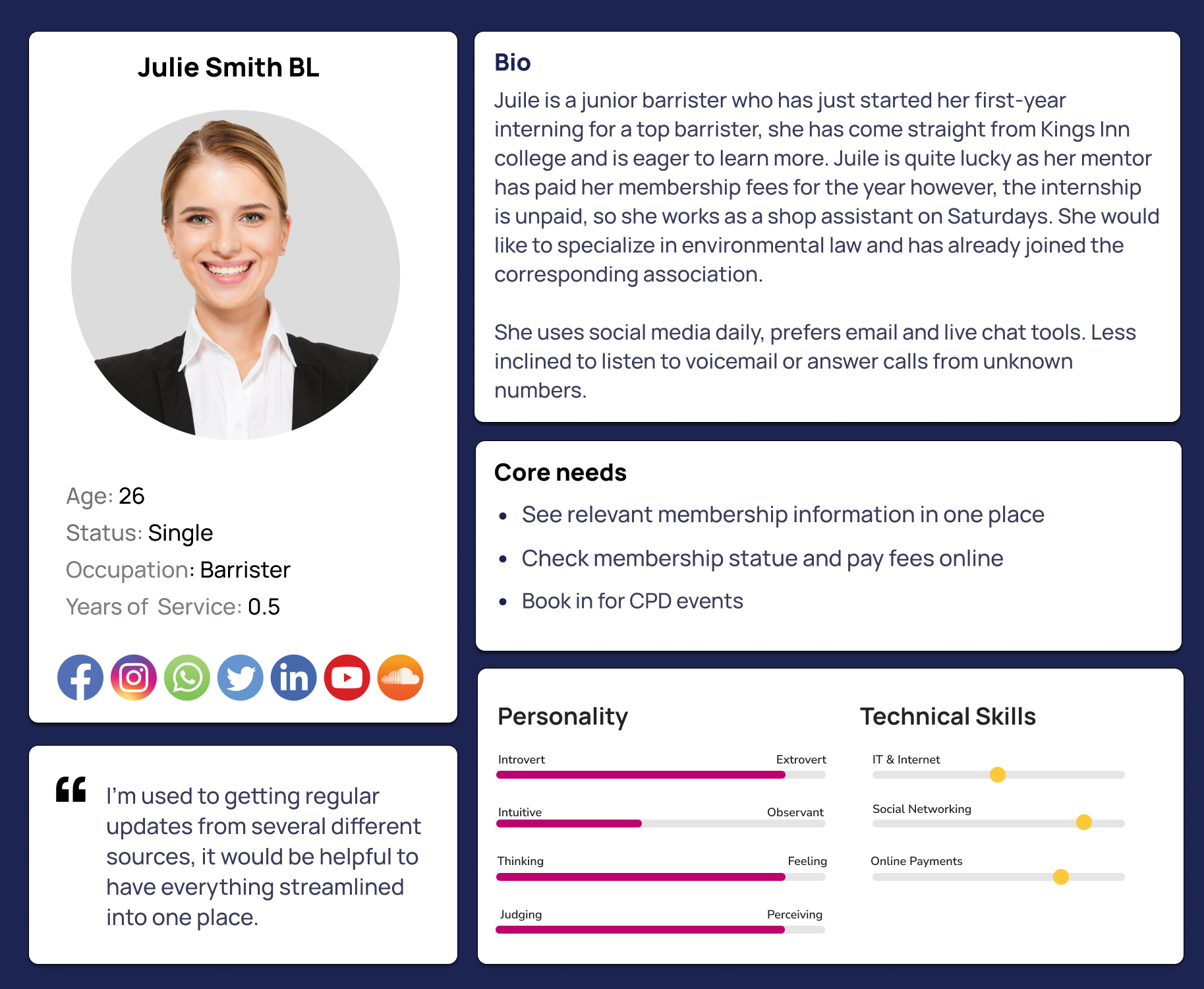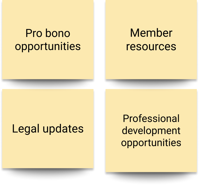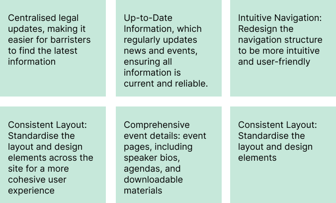 “I would like the CPD events to be front and center, as each barrister needs to obtain 12 CPD points per year to stay in practice. Additionally, having links to past events so they can watch events they couldn’t attend would be very helpful.”