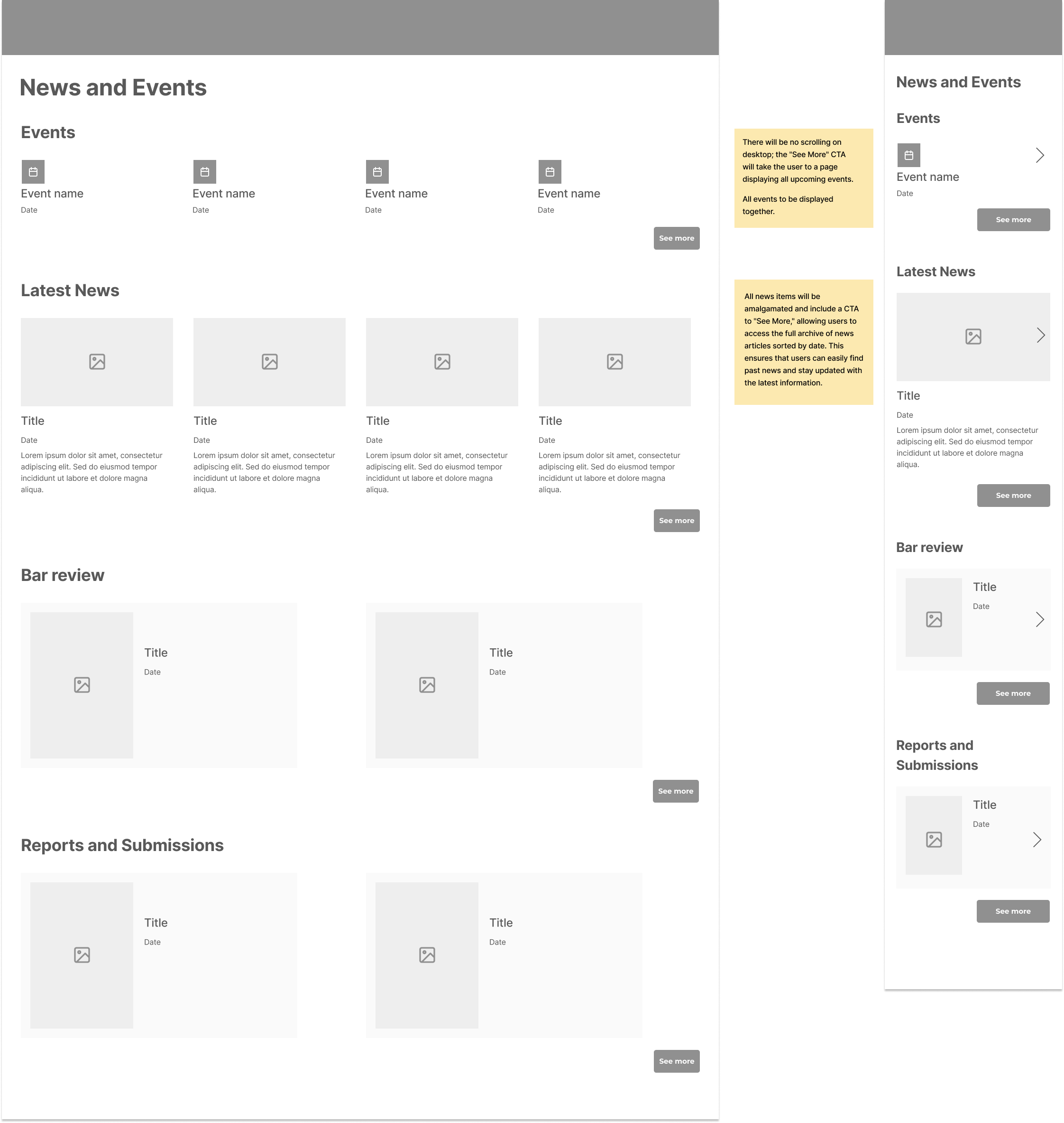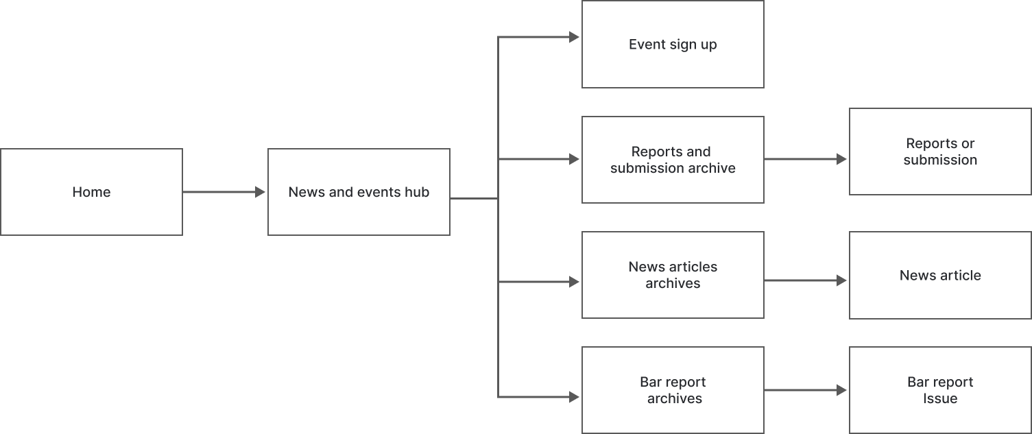 The objective of the wireframe and system testing was to evaluate the effectiveness of restructuring the news and events page. This included consolidating news updates into a single “Latest News” section, unifying events for a cleaner appearance, and integrating key sections such as “The Bar Review Magazine” and “Reports and Submissions.” The goal was to ensure users could easily navigate to detailed content, including news articles, events, magazines, and reports, and to validate that the new layout provided a streamlined and user-friendly experience.