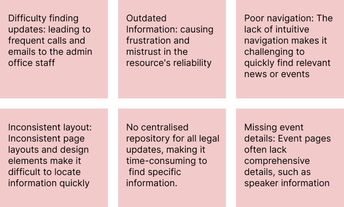 Focus Groups: As we had the client base, we were designing for at our fingertips we really took advantage of the situation. We sent out a request for barristers to join a focus group to voice what they would like to see on their personalize news and events page and the pain points they have with the current set up.