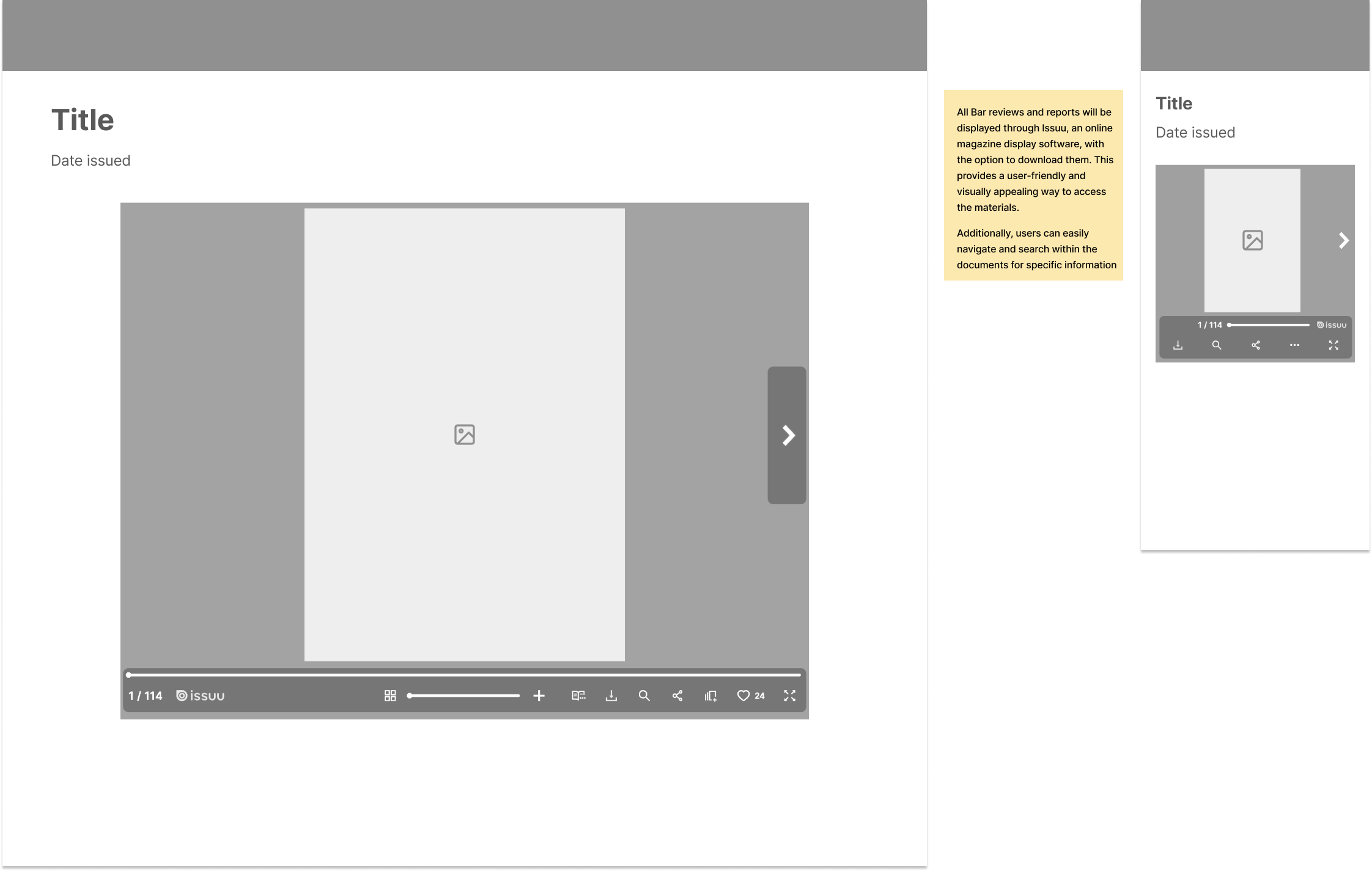 The Bar Review and the Reports and Submissions sections work similarly: users can either click on an individual card or the “See All” CTA. The integration of ISSUU is used for both, creating a realistic flip-through interaction and providing a downloadable PDF version.
