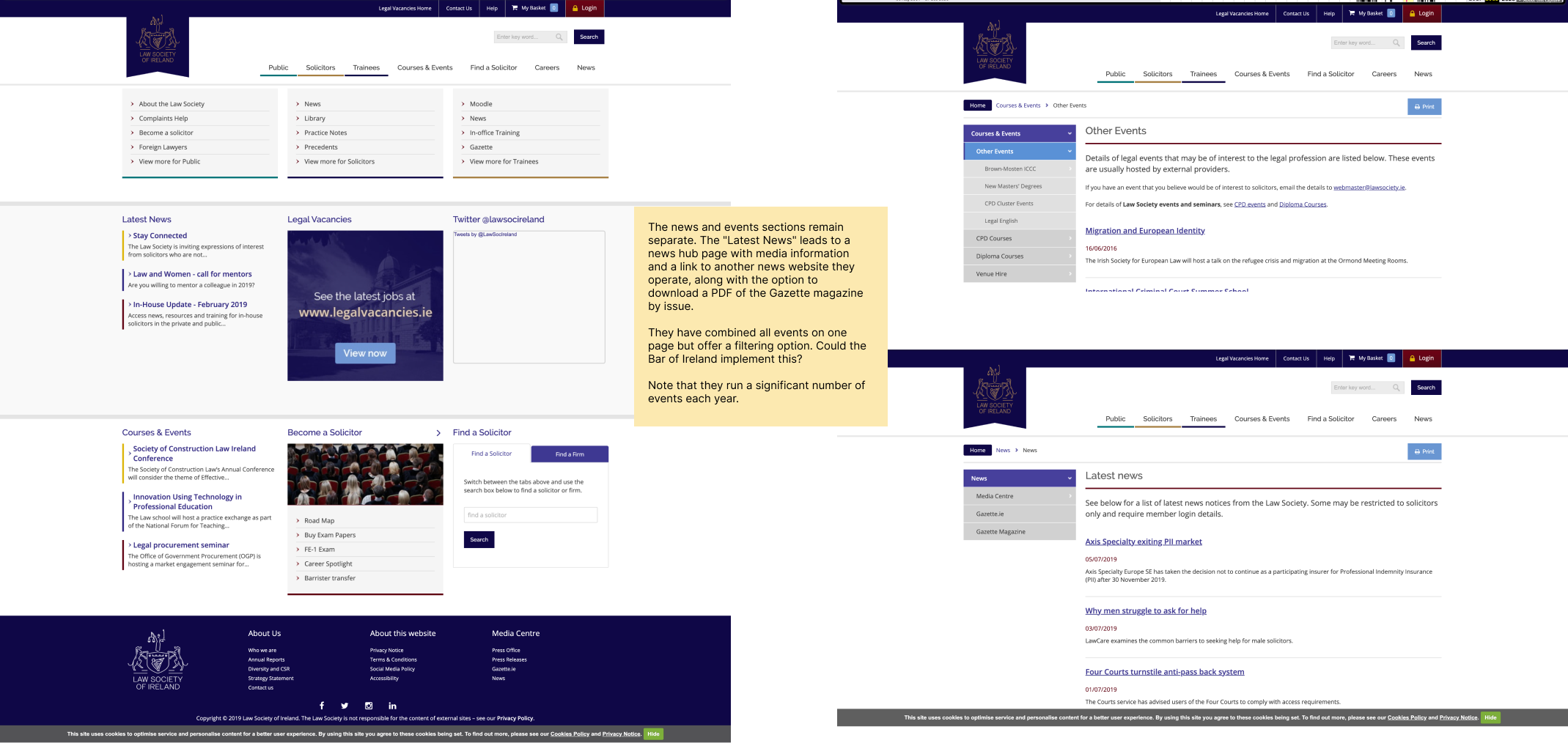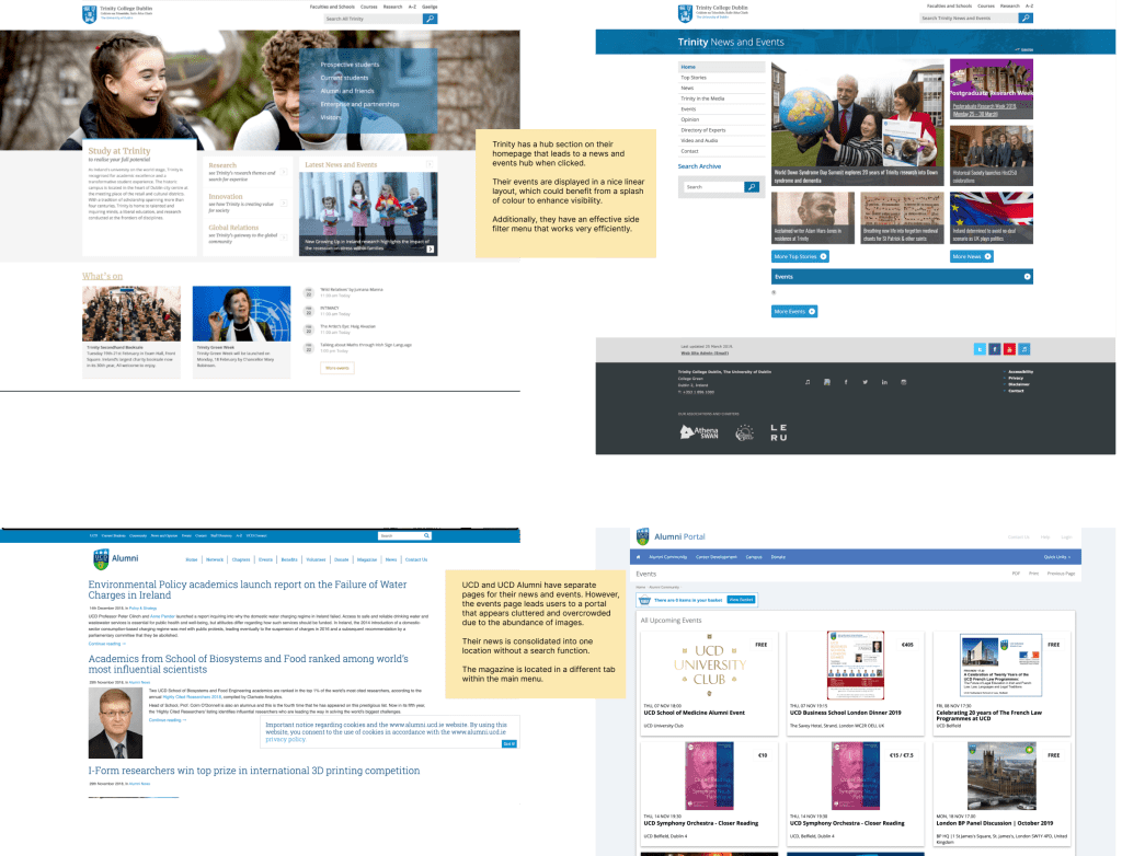 To gain valuable insights and benchmark best practices, I chose to examine UCD, Trinity College, and the Law Society. These institutions were selected because they represent leading academic and professional bodies within the legal field, and their websites are known for effectively communicating news and events to a similar audience. By analysing their layout, design elements, and user engagement strategies, I aimed to identify key features and innovative approaches.