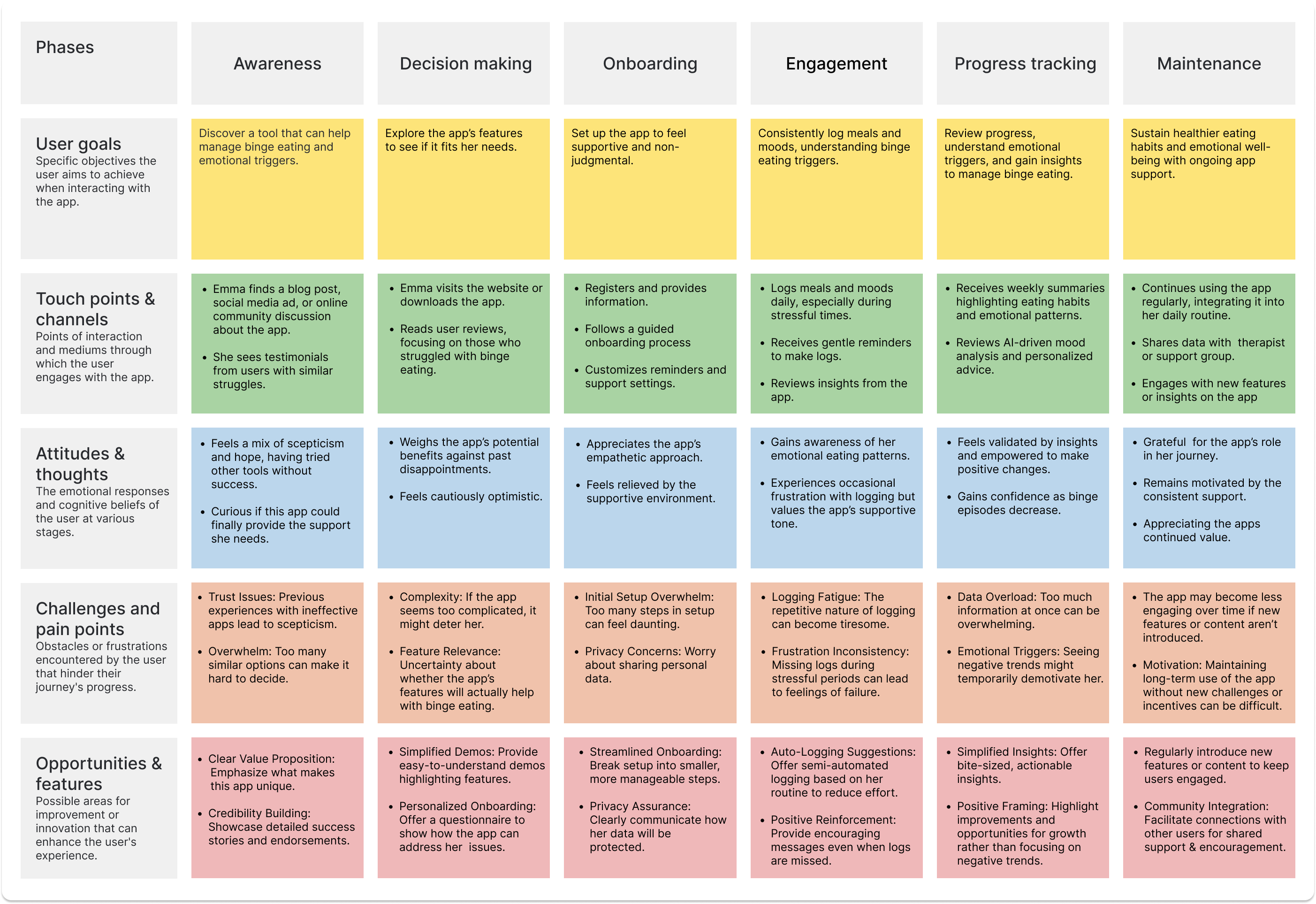 A detailed User Journey Map was done on Emma The Binge Eater, with Pain Points and Opportunities for Improvement It helps to understand user needs, identify challenges like logging consistency or emotional barriers, and spot areas for enhancement. This approach ensures that the app effectively supports users, improves retention, and clearly communicates the vision to stakeholders.
