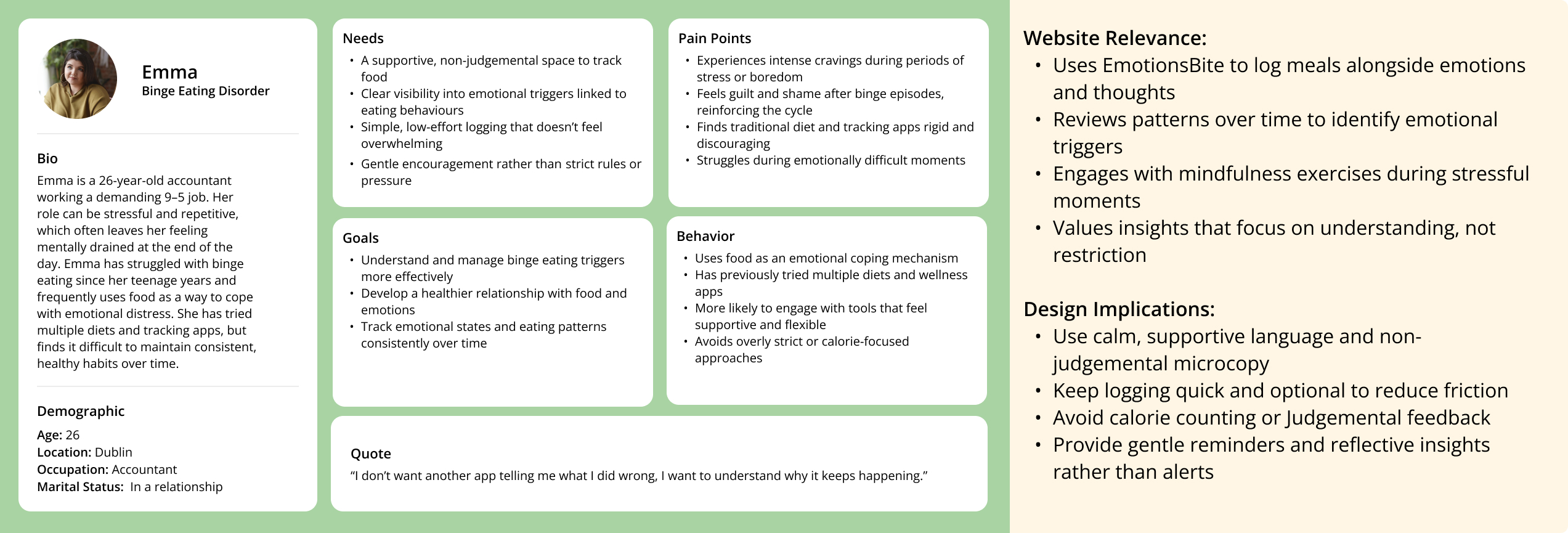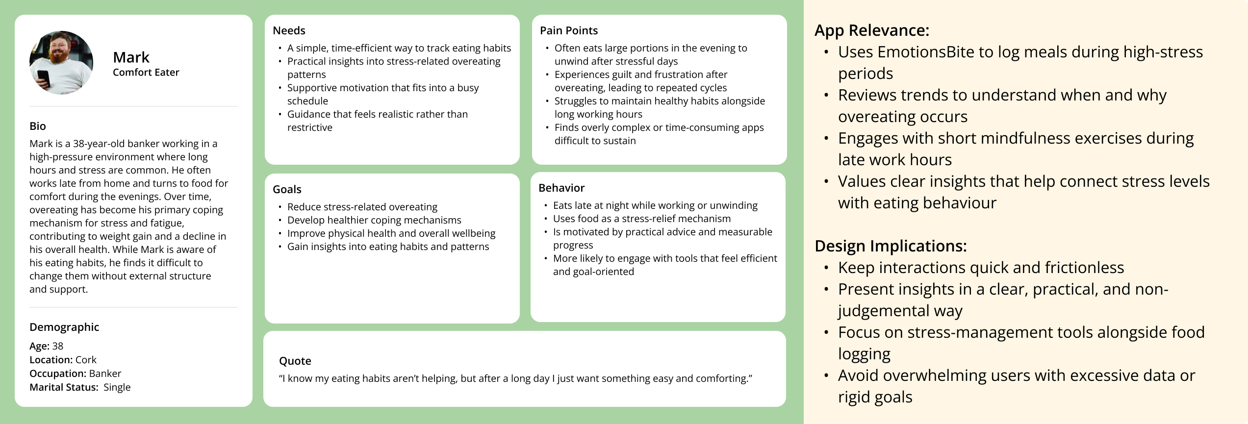 To develop these personas, I combined insights research on emotional eating, The interview and survey data, and an analysis of common eating behavior patterns (binge eating, emotional snacking, and stress-related overeating). This process allowed me to identify two representative user types: Emma the Binge Eater and Mark the Overeater each with distinct goals and challenges. By returning to these personas throughout the design process, I can evaluate whether design decisions truly align with user expectations and provide meaningful, empathetic support.