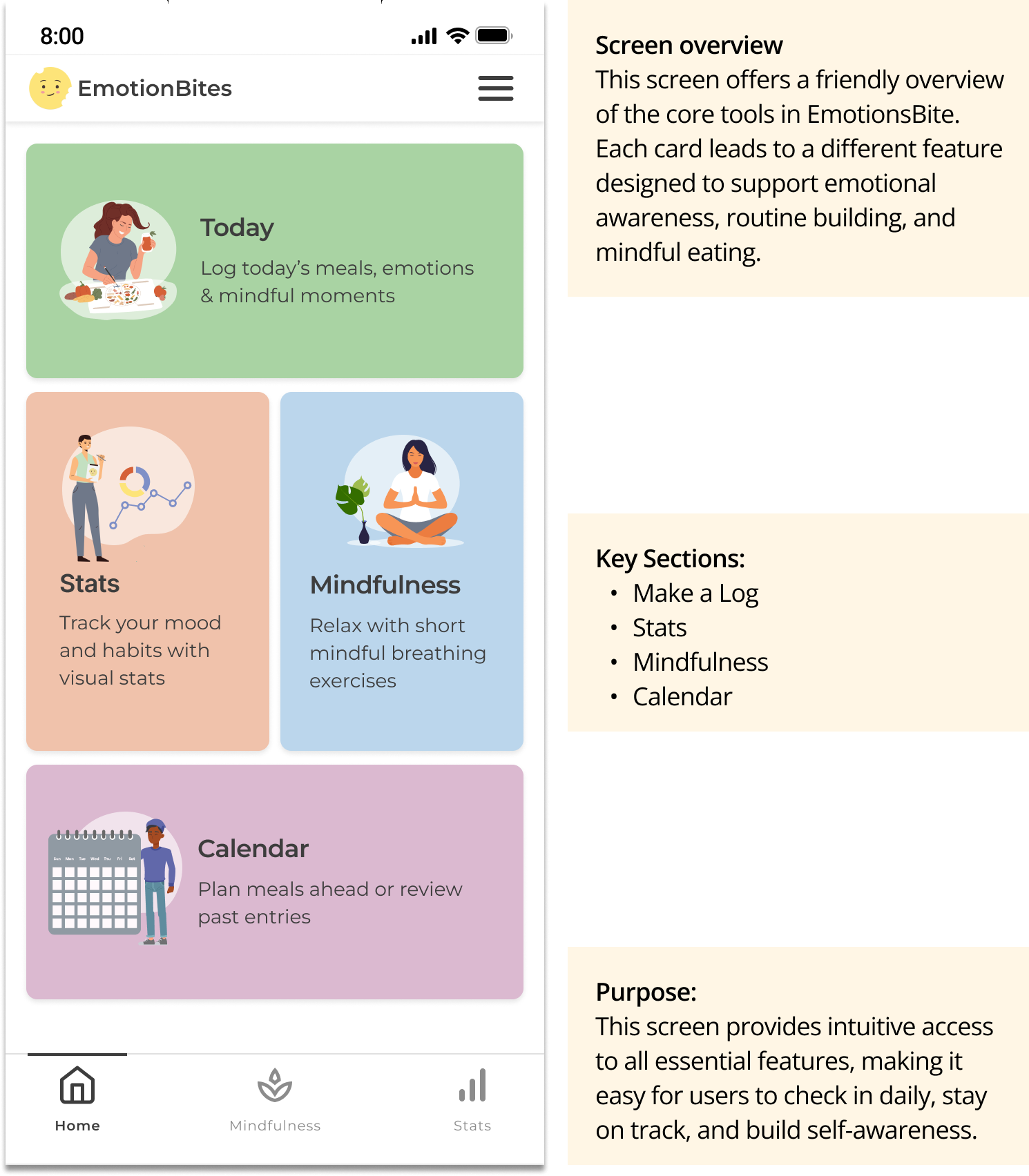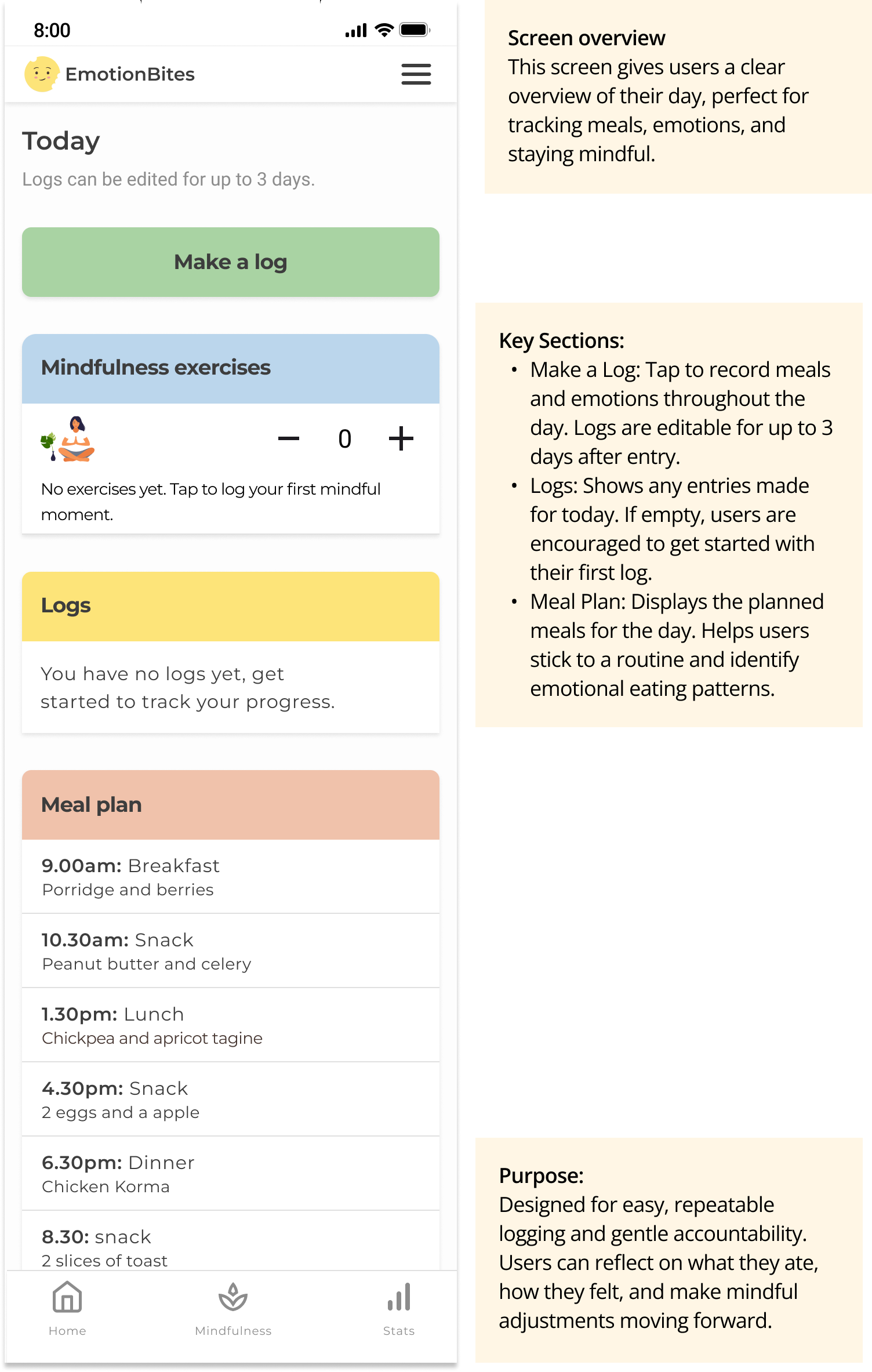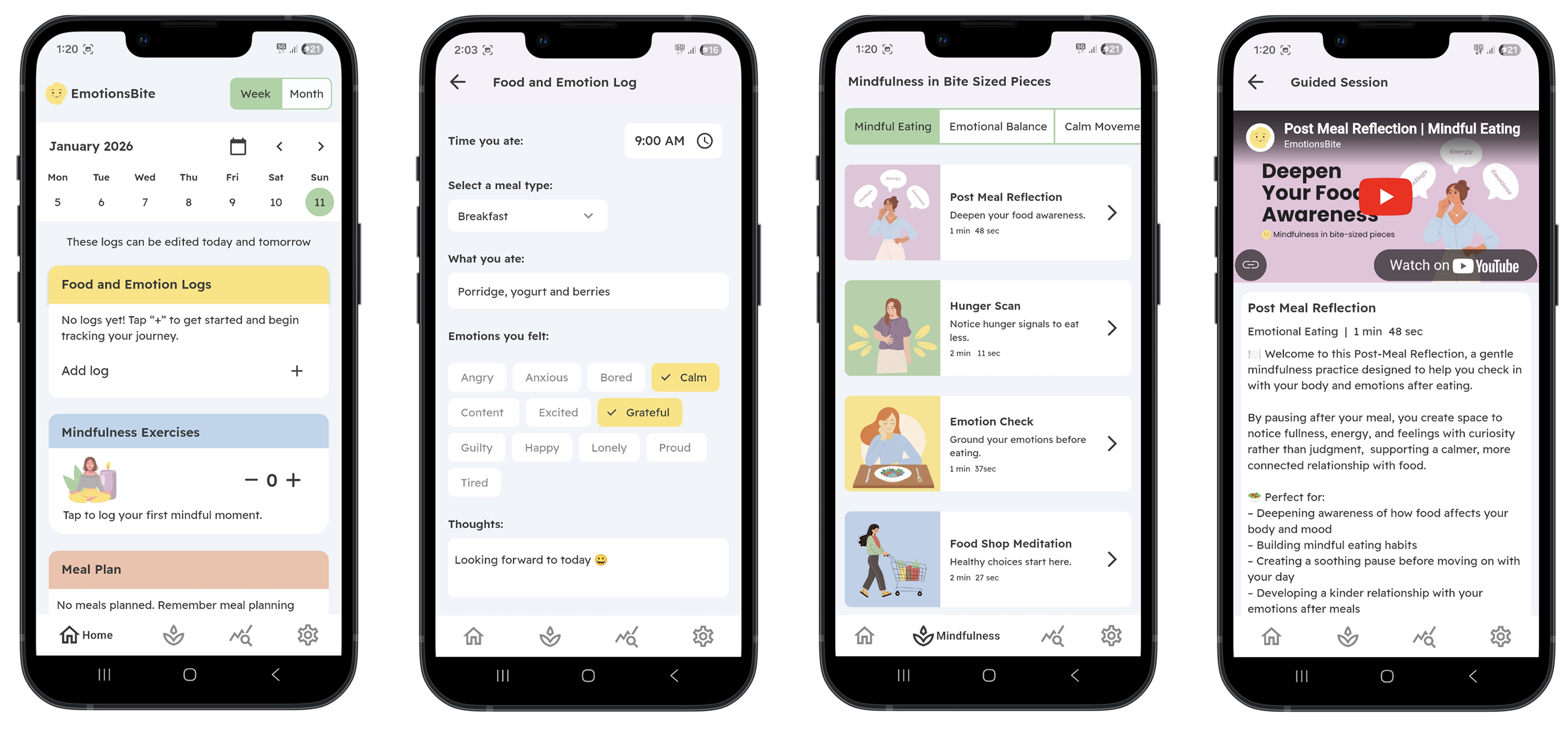 In response, I designed EmotionsBite as a supportive, non-judgmental space that combines meal, mood, and thought logging with mindfulness resources. The app encourages self-awareness, stress regulation, and healthier habits without restrictive tracking. The long-term vision is to integrate AI-driven insights, recipe suggestions, and a support network to provide personalized guidance in a safe and compassionate way.