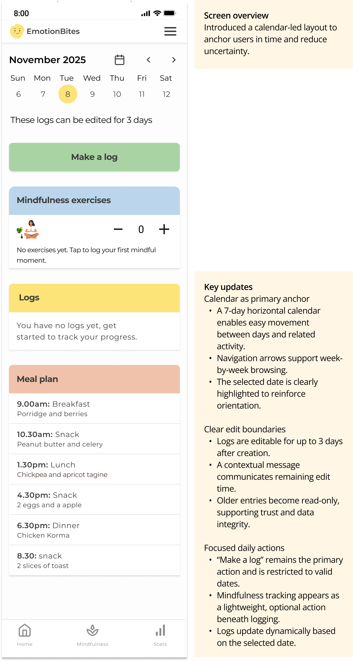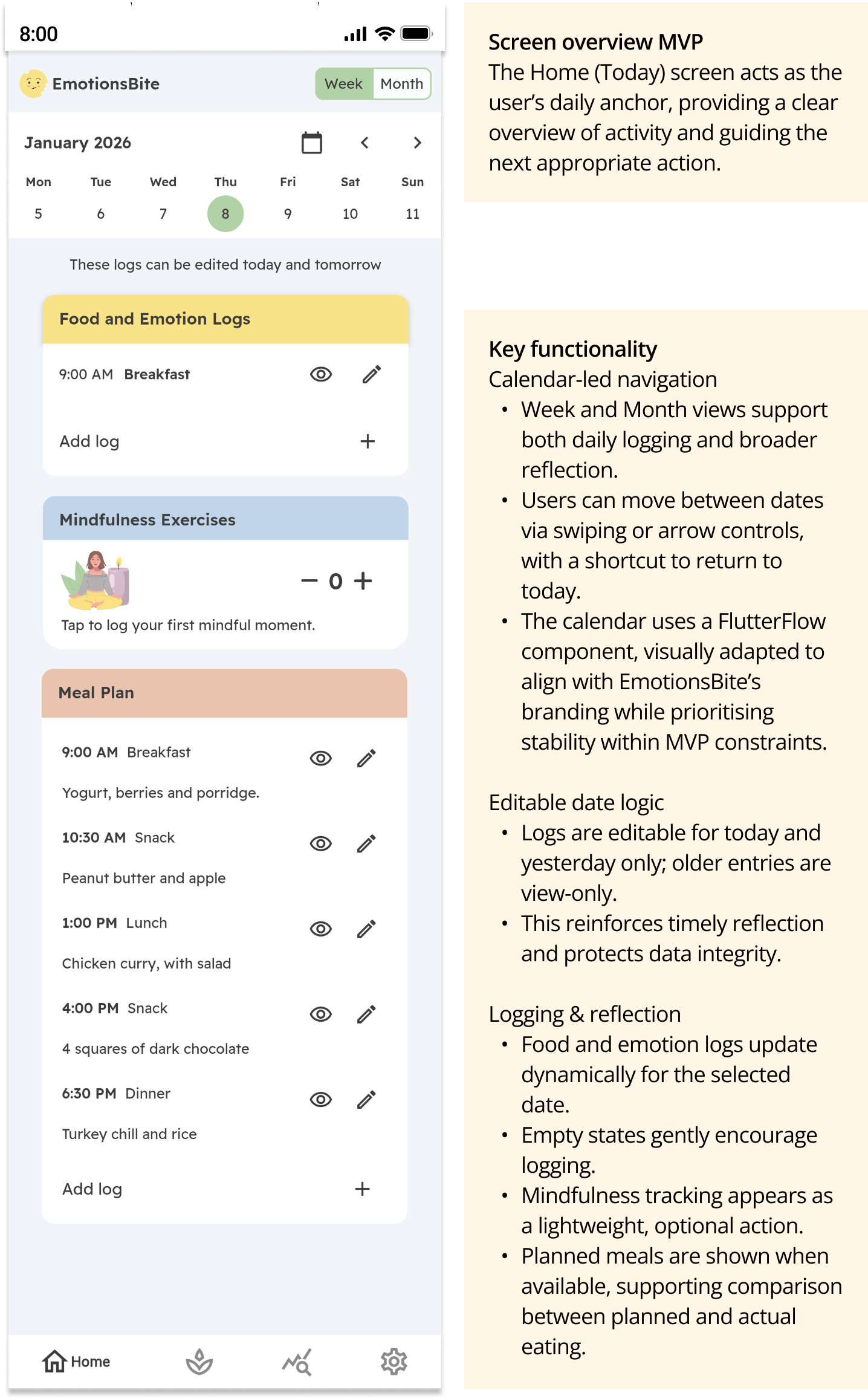 This section highlights the iterative design and testing of the EmotionsBite Home screen. User feedback and usability testing informed each iteration, gradually reducing complexity and improving clarity. The final design prioritises time-based orientation, gentle guidance, and reliable core actions in preparation for MVP testing.