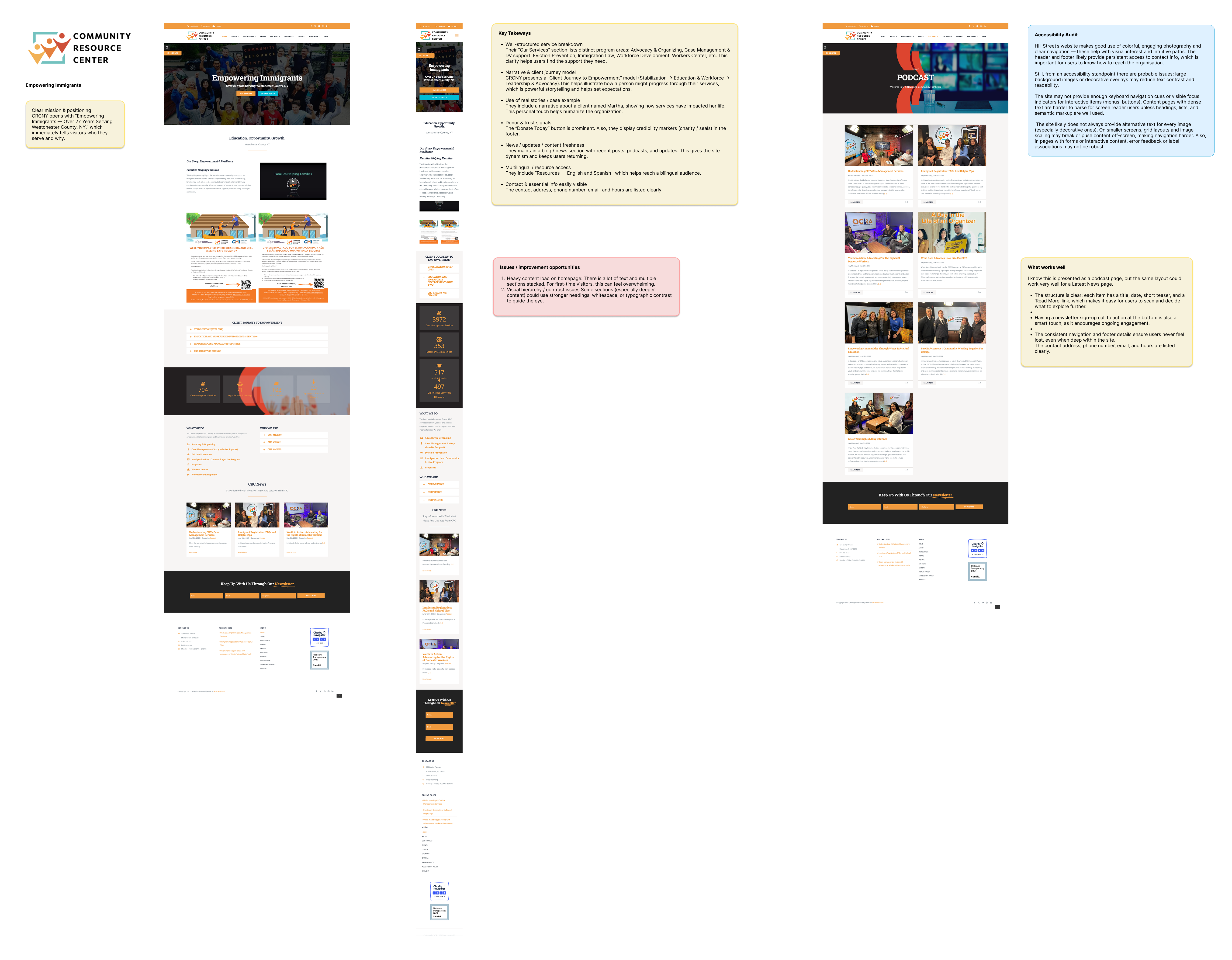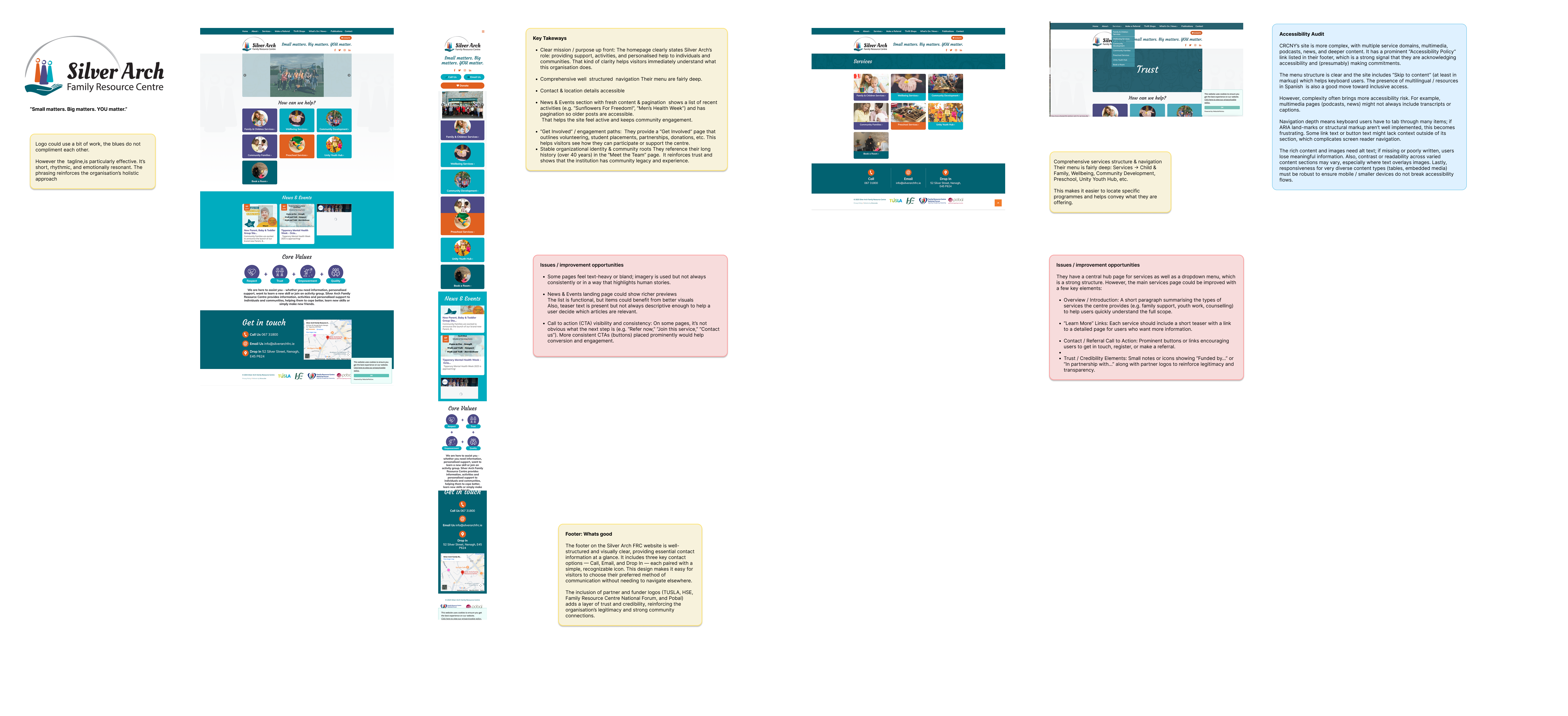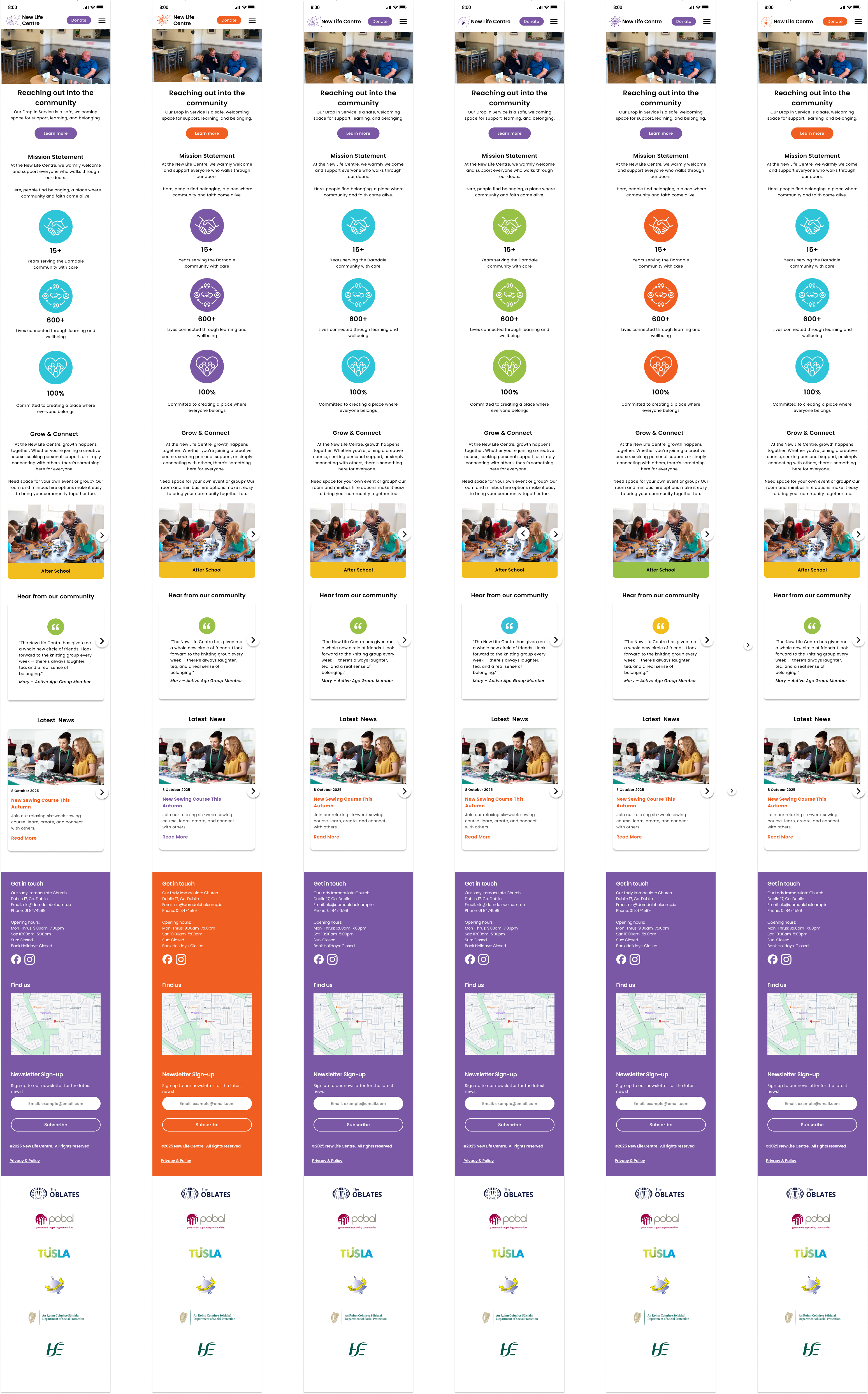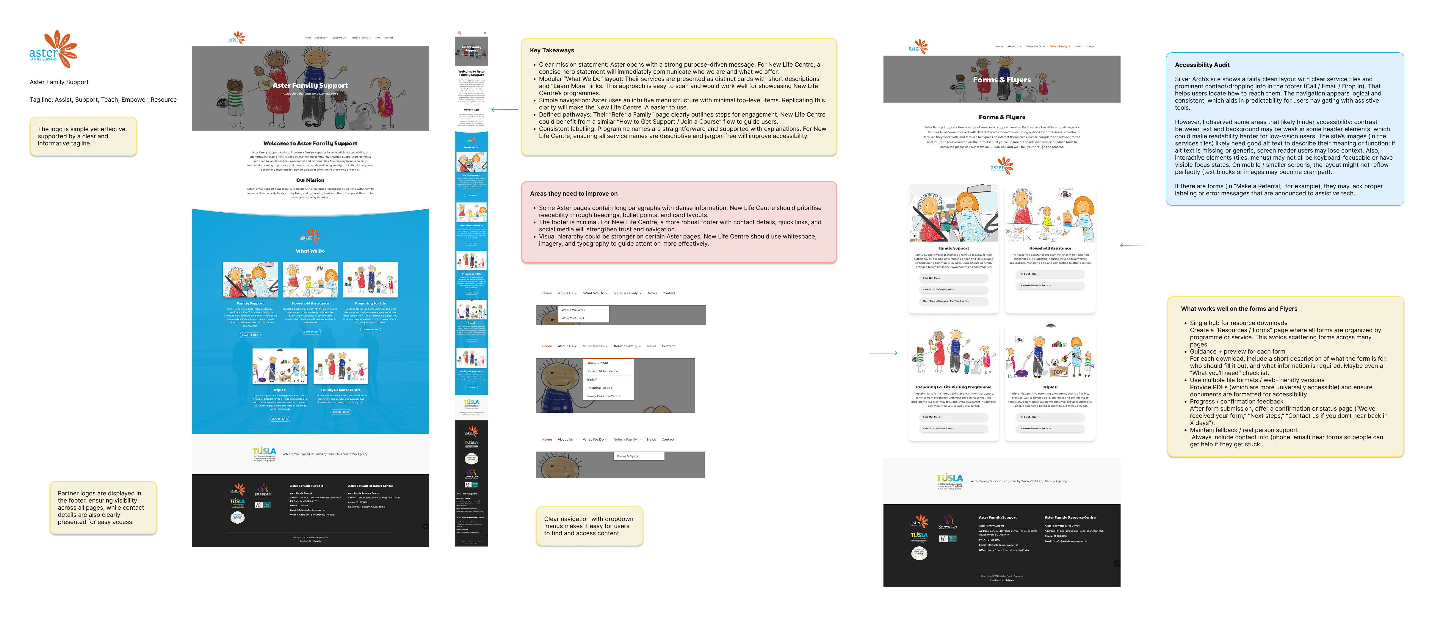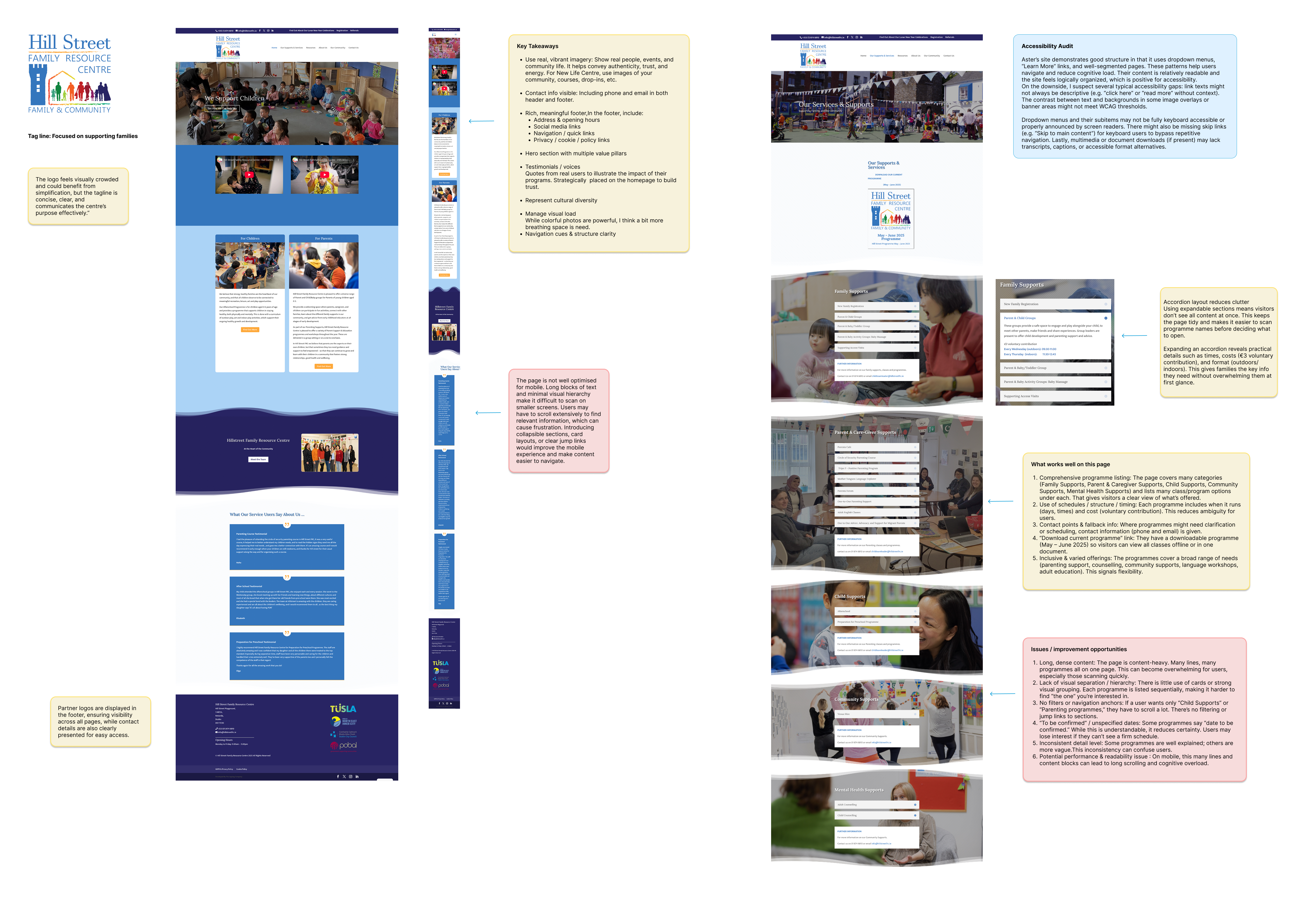 Market research was conducted to evaluate the design, structure, and accessibility of existing community centre websites in Ireland, the UK, and the US. The goal was to identify best practices and common pain points that could inform the redevelopment of the New Life Centre website. Four organisations were selected for detailed analysis, Aster Family Support, Hill Street Family Resource Centre, Silver Arch Family Resource Centre, and the Community Resource Center (New York). Each site was reviewed for layout clarity, navigation flow, accessibility, and content presentation. The findings helped highlight what works well in community-focused design such as clear pathways, inclusive visuals, and strong calls to action — while also uncovering common issues like text-heavy layouts, limited mobile optimisation, and inconsistent accessibility features. These insights directly shaped the new design direction for the New Life Centre, ensuring it meets both community needs and modern usability standards