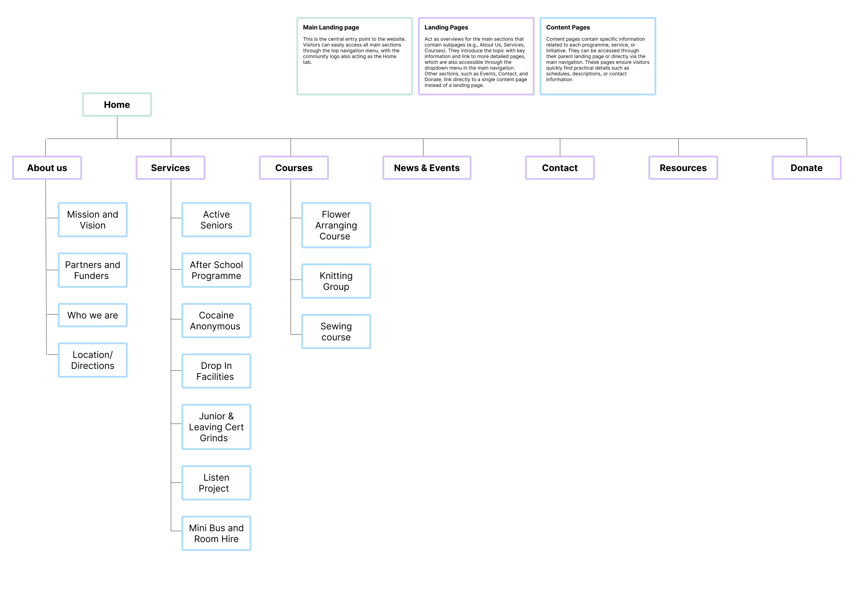 The new Information Architecture was designed to balance clarity, inclusivity, and community engagement. Each top-level menu item reflects a key area of the centre’s work from support services to education and social activities ensuring users can quickly locate what’s most relevant to them. Grouping related subpages under intuitive categories (e.g., Services, Courses, About Us) reduces cognitive load and supports easier wayfinding for users of all ages and digital literacy levels. The addition of a dedicated Resources section improves accessibility by providing downloadable materials and practical information, while a visible Contact and Donate menu helps drive engagement and community support. Overall, this structure promotes a more welcoming, user-centred experience that aligns with the New Life Centre’s mission of inclusion and empowerment.