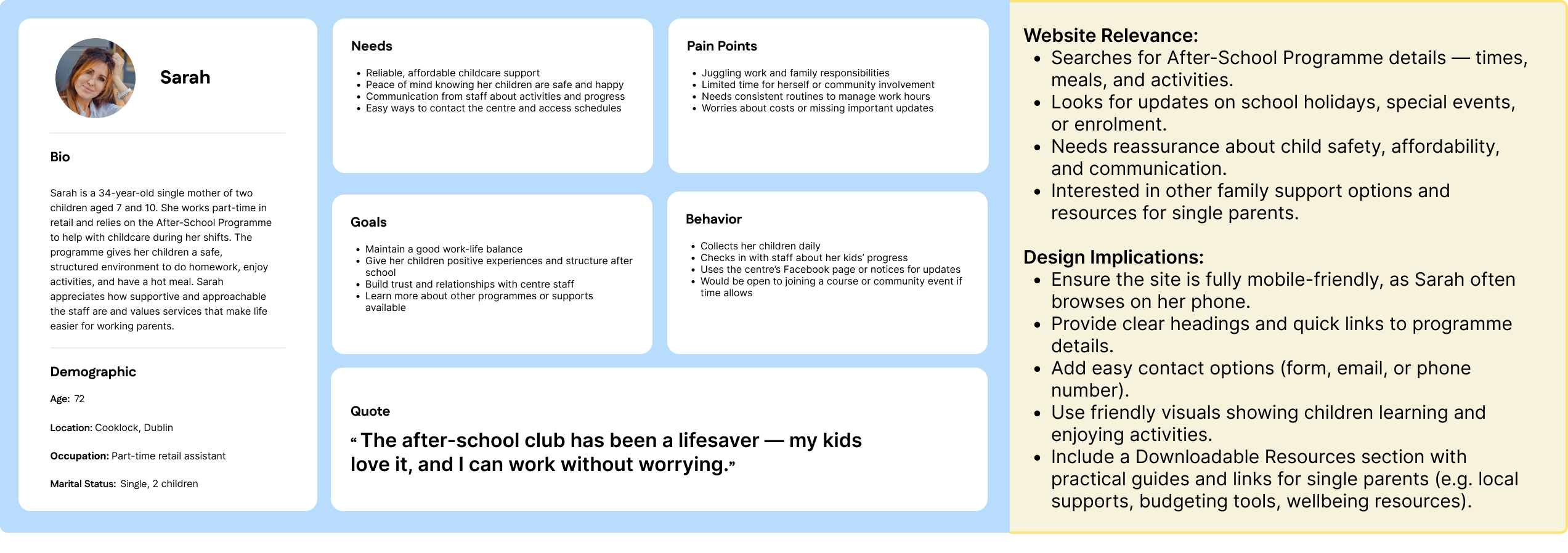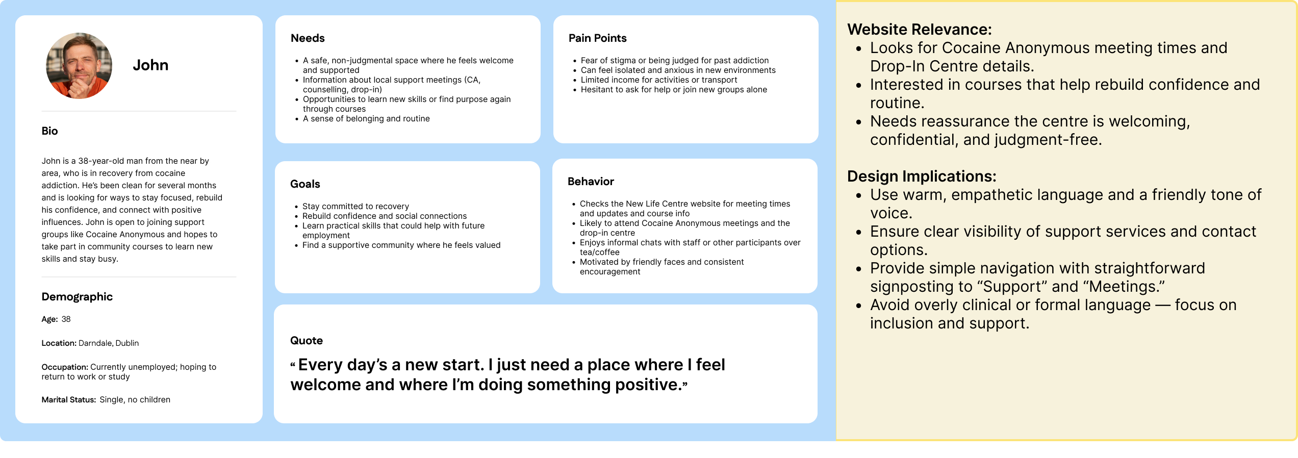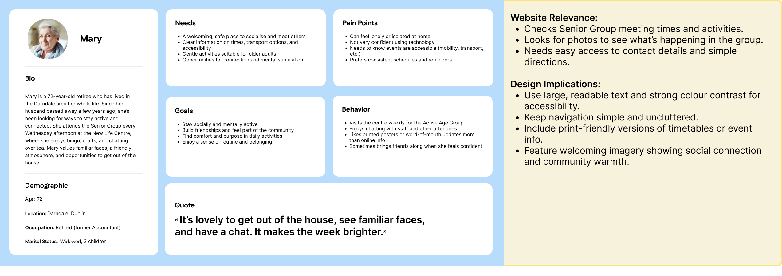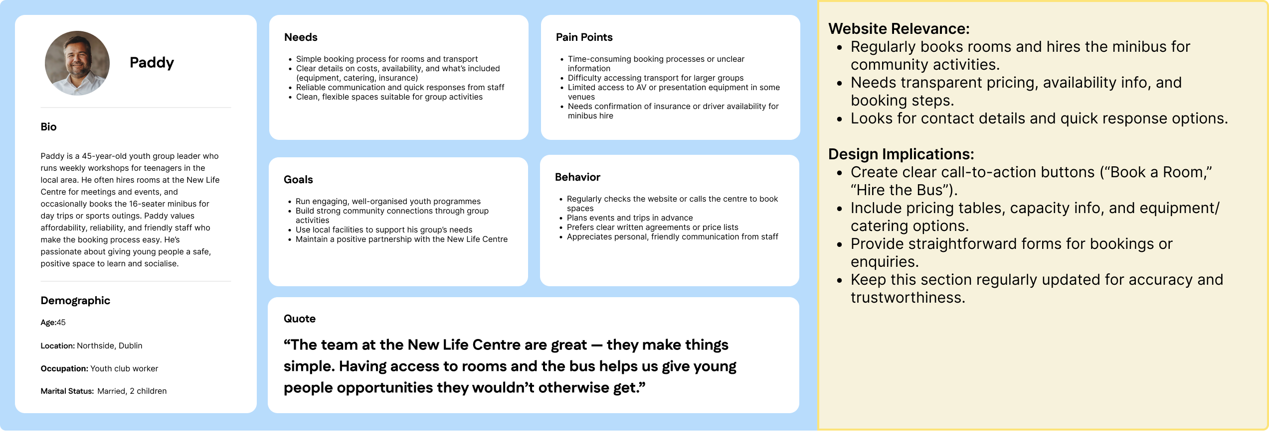 The following personas represent the diverse users of the New Life Centre website. Each persona captures a key audience group from within the Darndale community, reflecting different needs, goals, and challenges. Together, they guide the website’s tone, structure, and functionality ensuring that the new design supports people of all ages and circumstances. These insights help the design stay empathetic, inclusive, and community-driven.