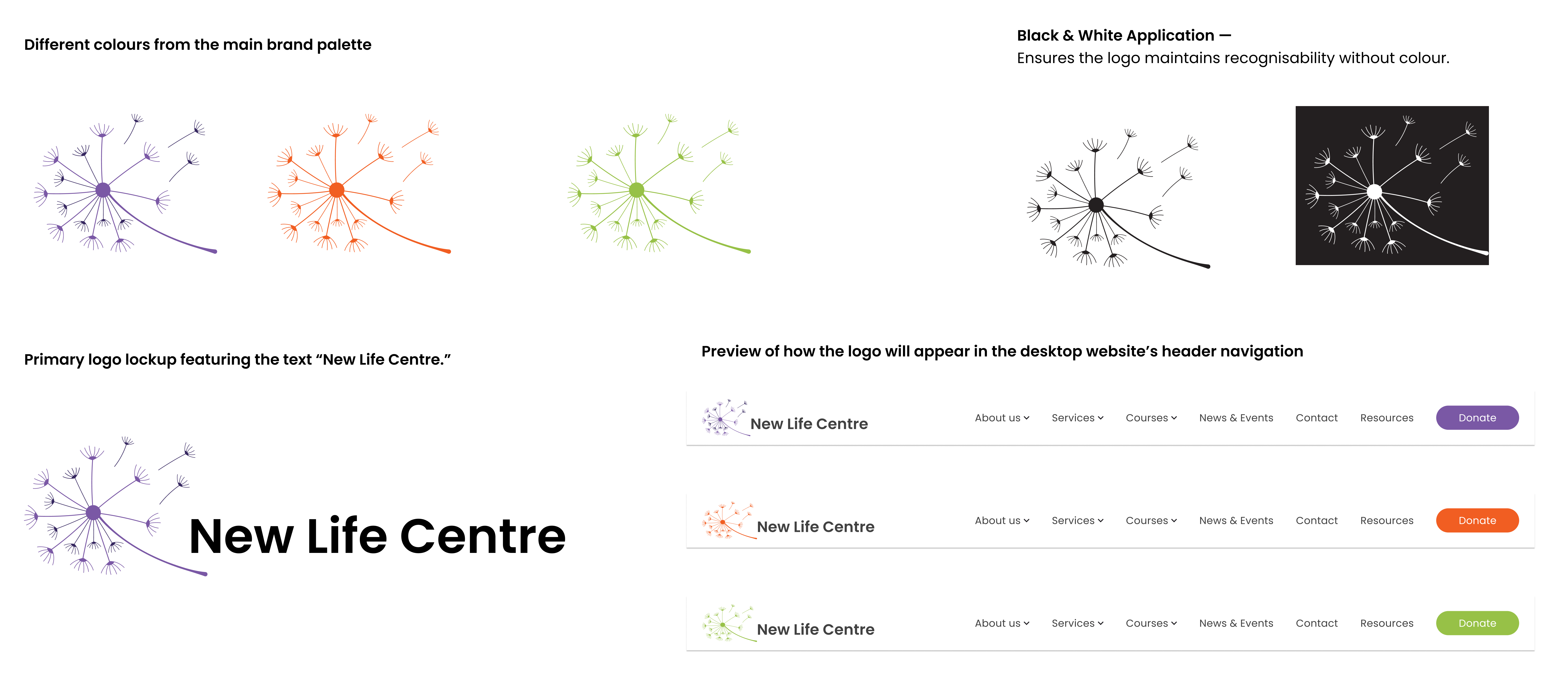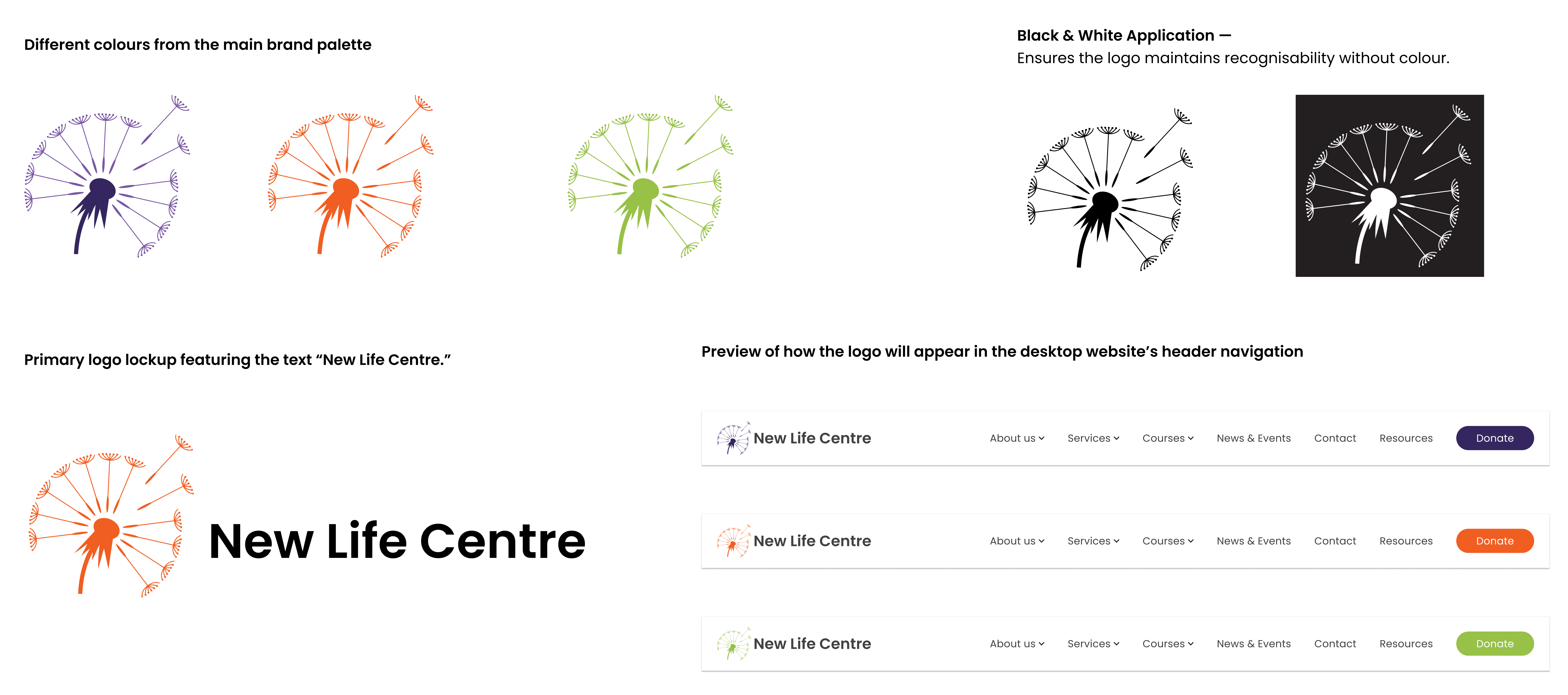 The dandelion logo idea was taken from the current website branding. The dandelion symbolises new beginnings, with its seeds drifting outward to represent the Centre’s reach into the community , spreading support, kindness, and hope. Each seed signifies an individual or family finding strength and new opportunities through connection.