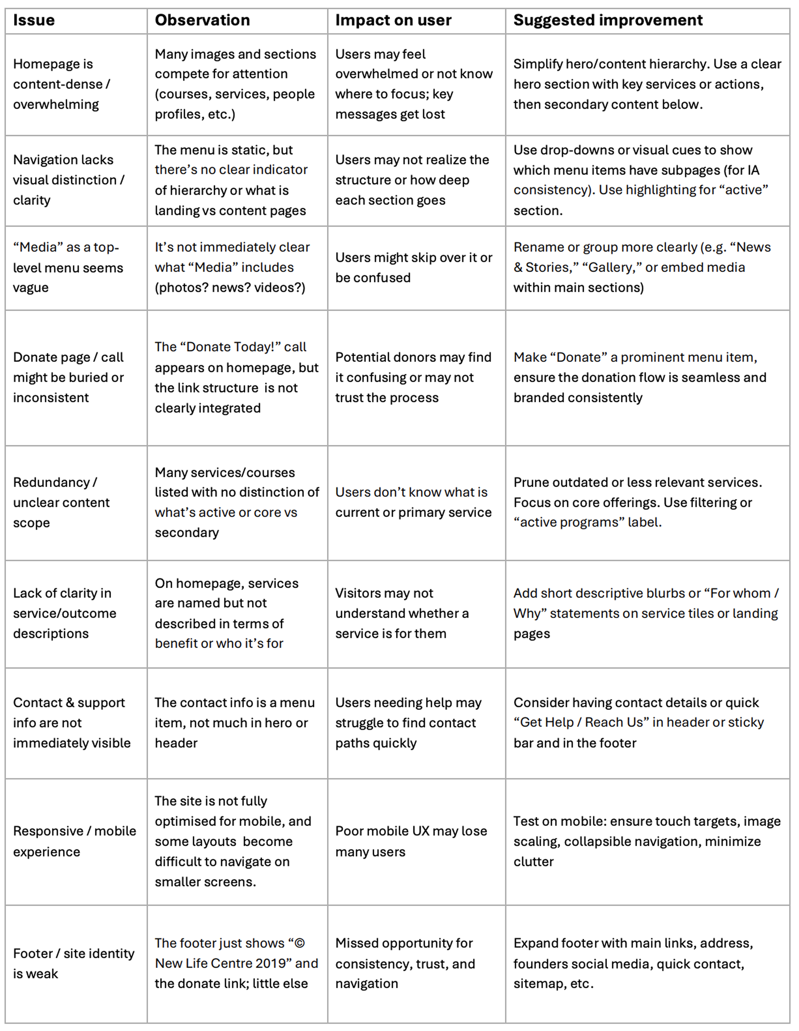The Home Page Audit was carried out to assess the current usability, accessibility, and content structure of the New Life Centre website. The goal was to identify areas where the homepage could better support users in quickly finding information, understanding available services, and feeling welcomed by the centre’s mission. By reviewing layout, navigation, visual hierarchy, and consistency, this audit highlights key barriers that may impact user engagement and trust. The findings provide a clear foundation for redesign decisions ensuring the new homepage will be more intuitive, inclusive, and aligned with the community-focused values of the New Life Centre