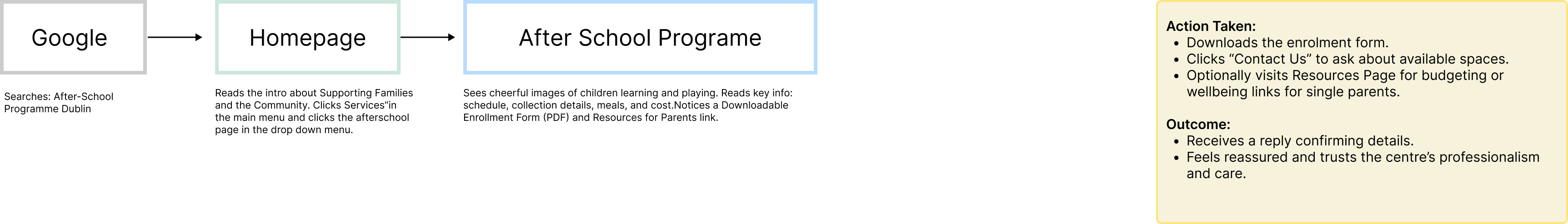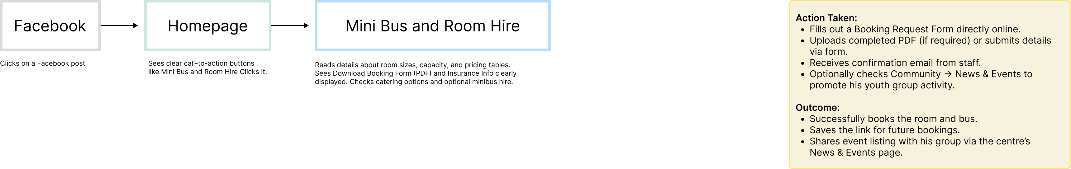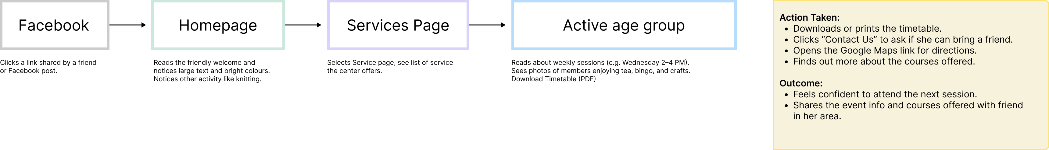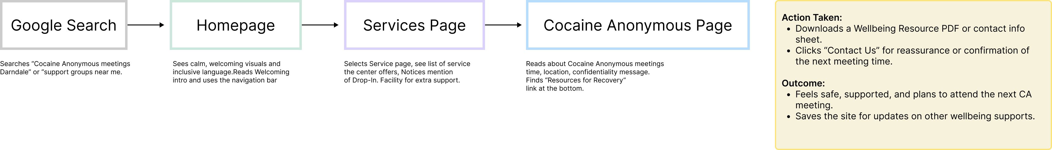 The following user flows were developed to represent the diverse ways members of the community engage with the New Life Centre’s online presence. Each flow reflects a real user persona, outlining their motivations, key steps, and desired outcomes. Together, these journeys ensure that the website structure supports easy access to information, reassurance, and engagement opportunities for all users.