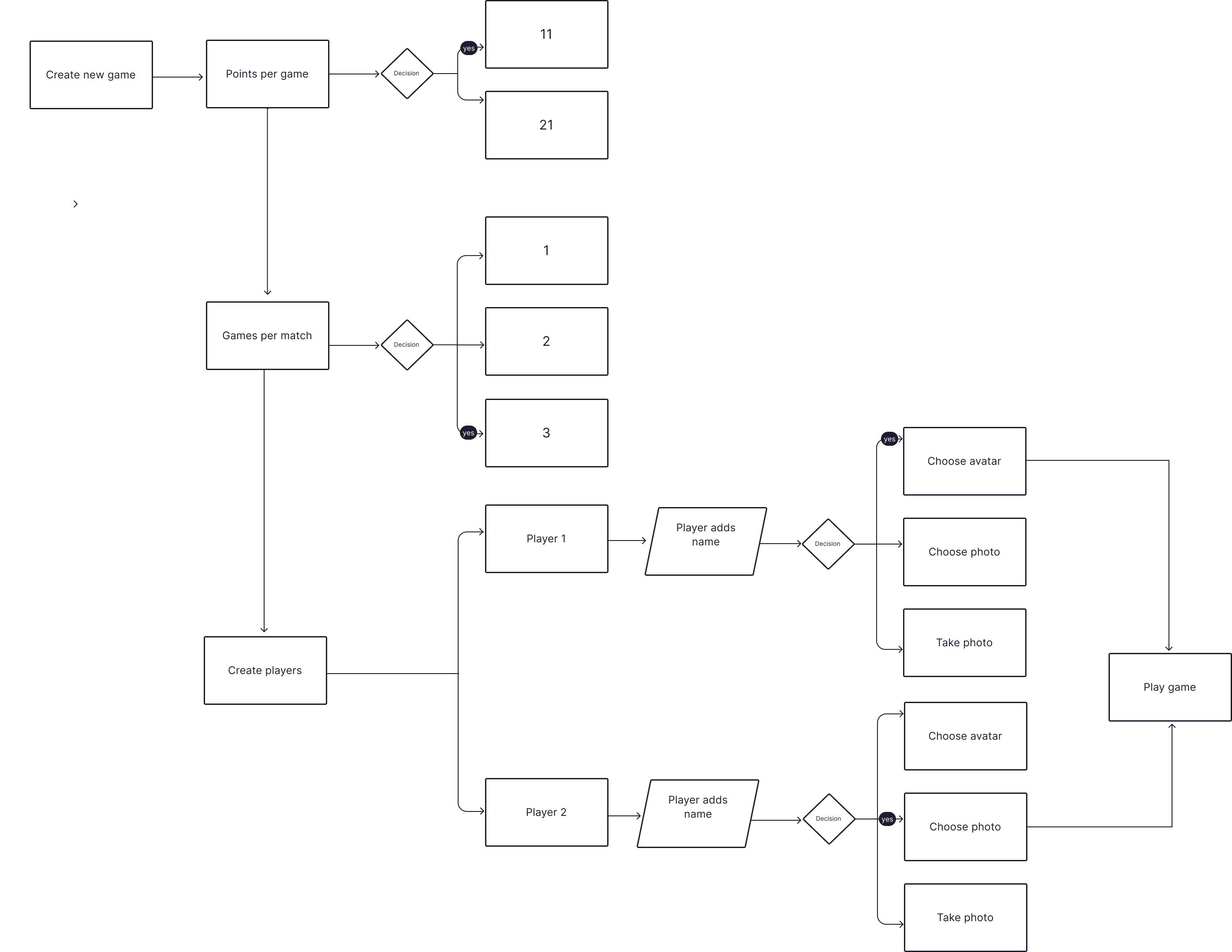 The User Flow Diagram for setting up a match illustrates the sequence of steps a user follows within the app, from starting on the splash screen to initiating the game. It begins with creating a new game, where users select the points per game (11 or 21) and the number of games per match (1, 2, or 3). Next, users proceed to create player profiles, which includes adding player names and choosing or taking a photo for avatars. This detailed flow ensures an intuitive setup process, enhancing user experience by providing clear, step-by-step guidance.