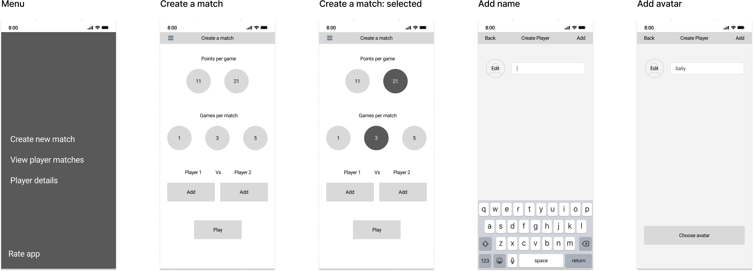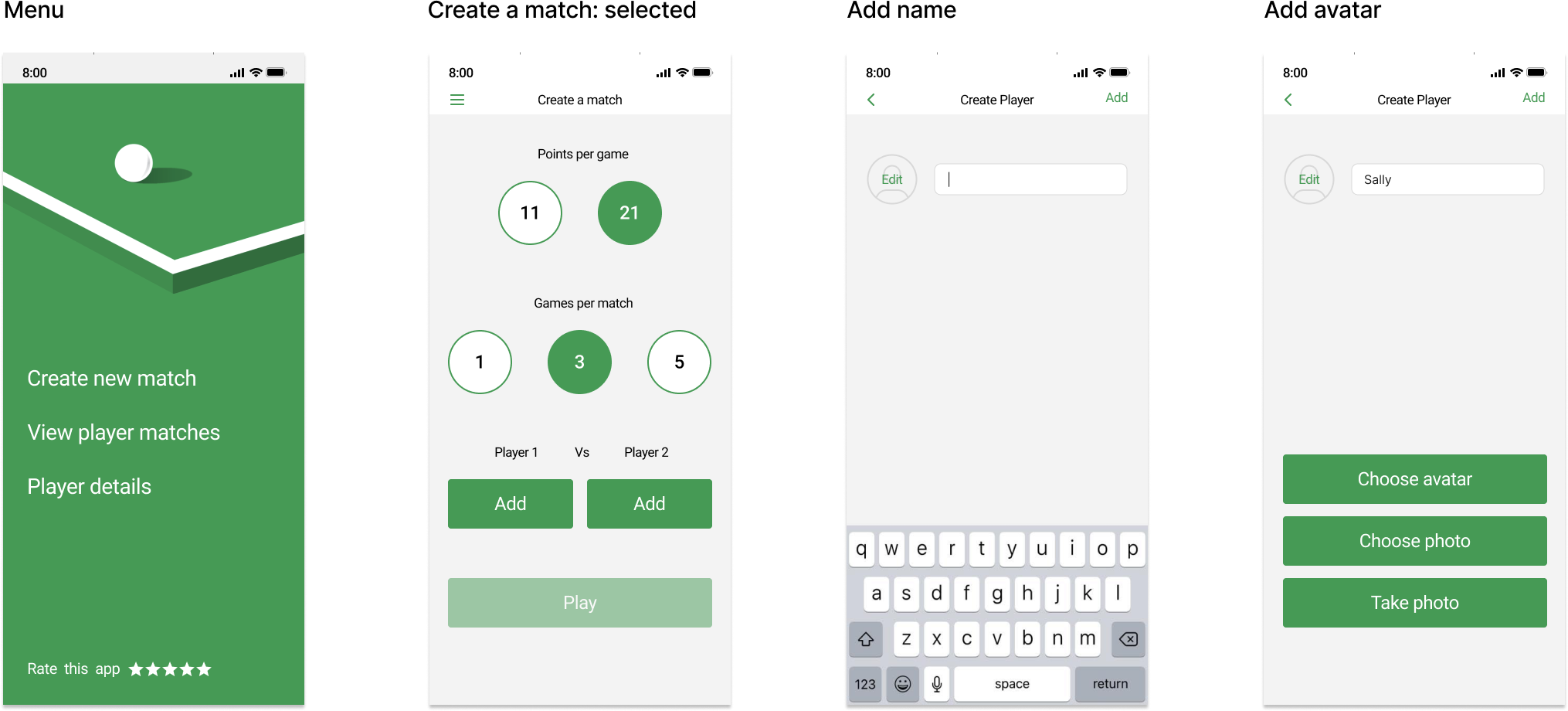 The app allows users to create new matches, view player match histories, and manage player details with added functionalities such as choosing avatars and taking photos and also share the results with others.