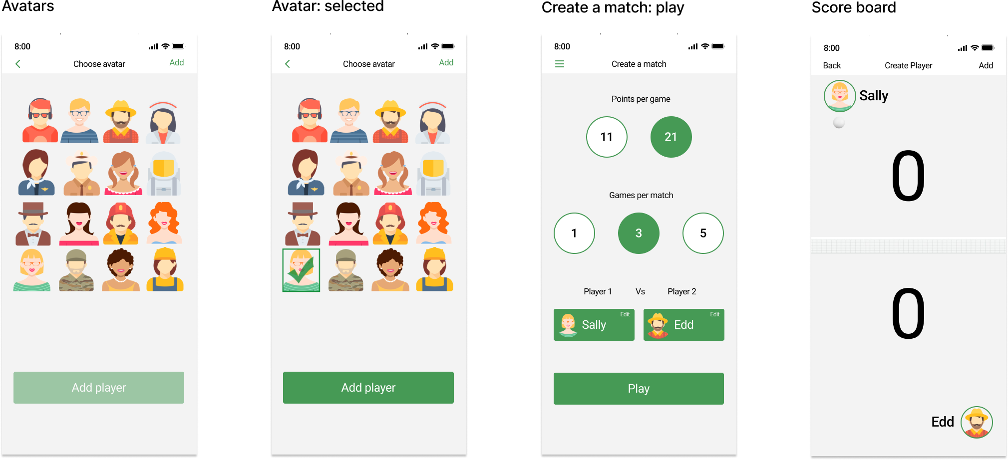 The high-fidelity wireframes feature a clean, modern design with intuitive navigation. Elements like player avatars and clear, bold text ensure that users can easily identify their selections and follow the match progress. The use of green as a primary color throughout the app maintains visual consistency and aligns with the theme of ping pong.