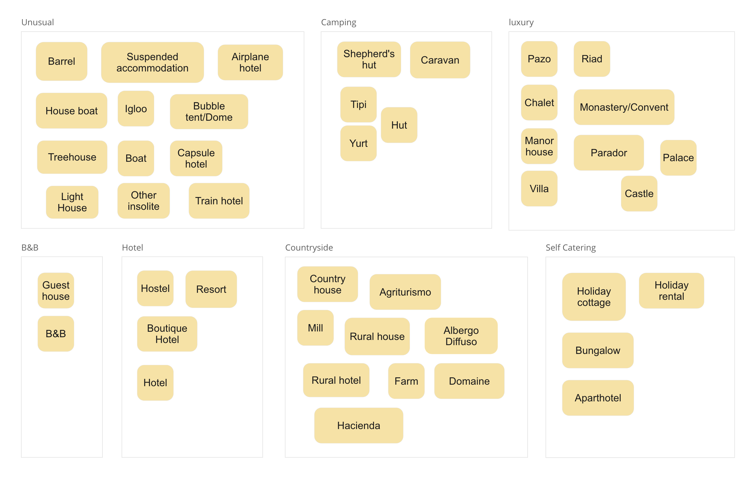 In Miro, each participant received the full list and was tasked with grouping similar items and naming those groups. After everyone had completed the exercise, we analyzed the groupings to identify patterns and consolidated the 51 property types into 7 aggregated categories. This approach was applied to all four universes. Below is an example of the aggregated types for the “stay” universe.