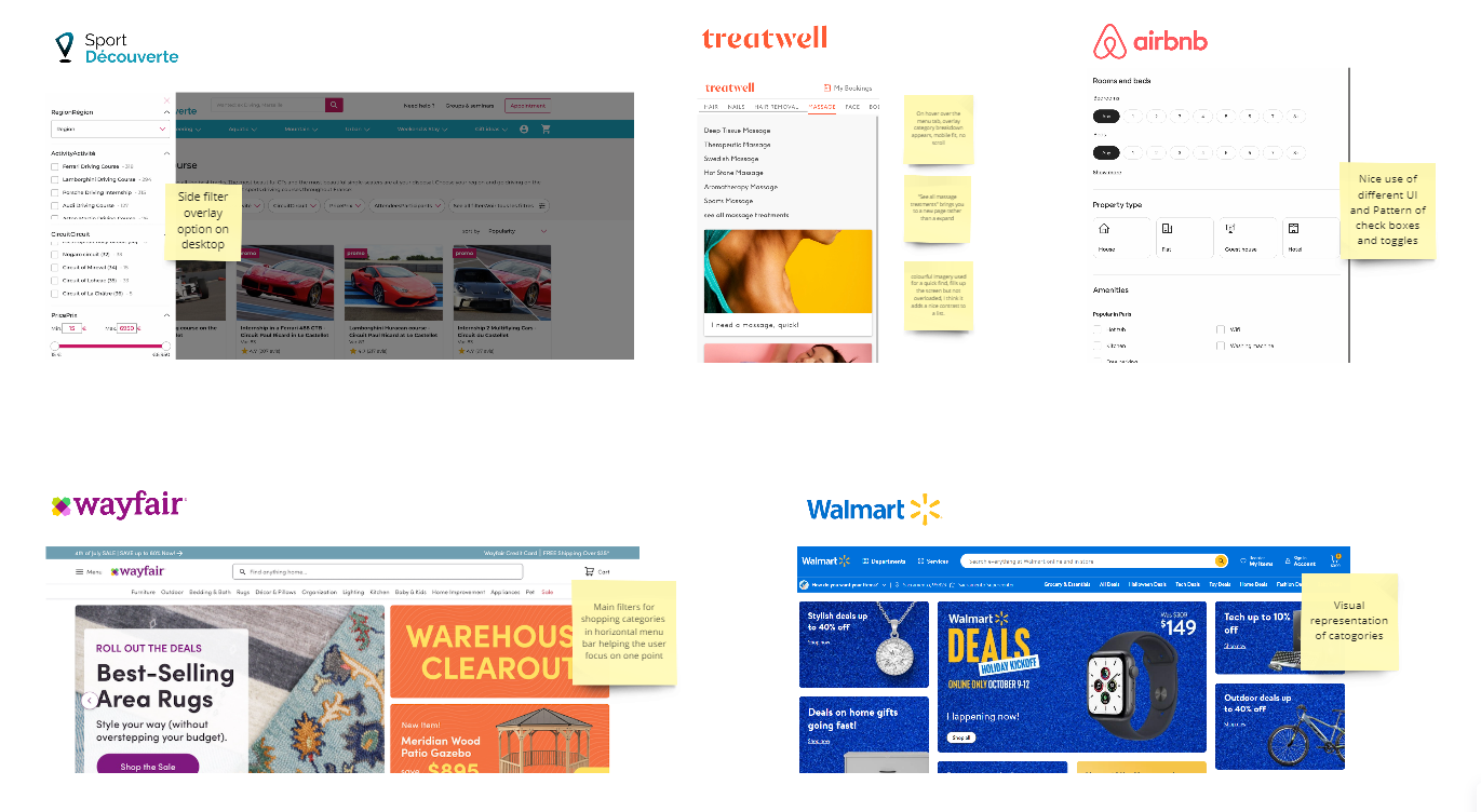 Given Smartbox’s unique business model, I conducted market research across a broad range of websites in the travel, retail, and beauty sectors. The goal was to understand how filters are presented: Are they automatically visible or hidden behind a button? Where is that button located? How are the filters displayed?