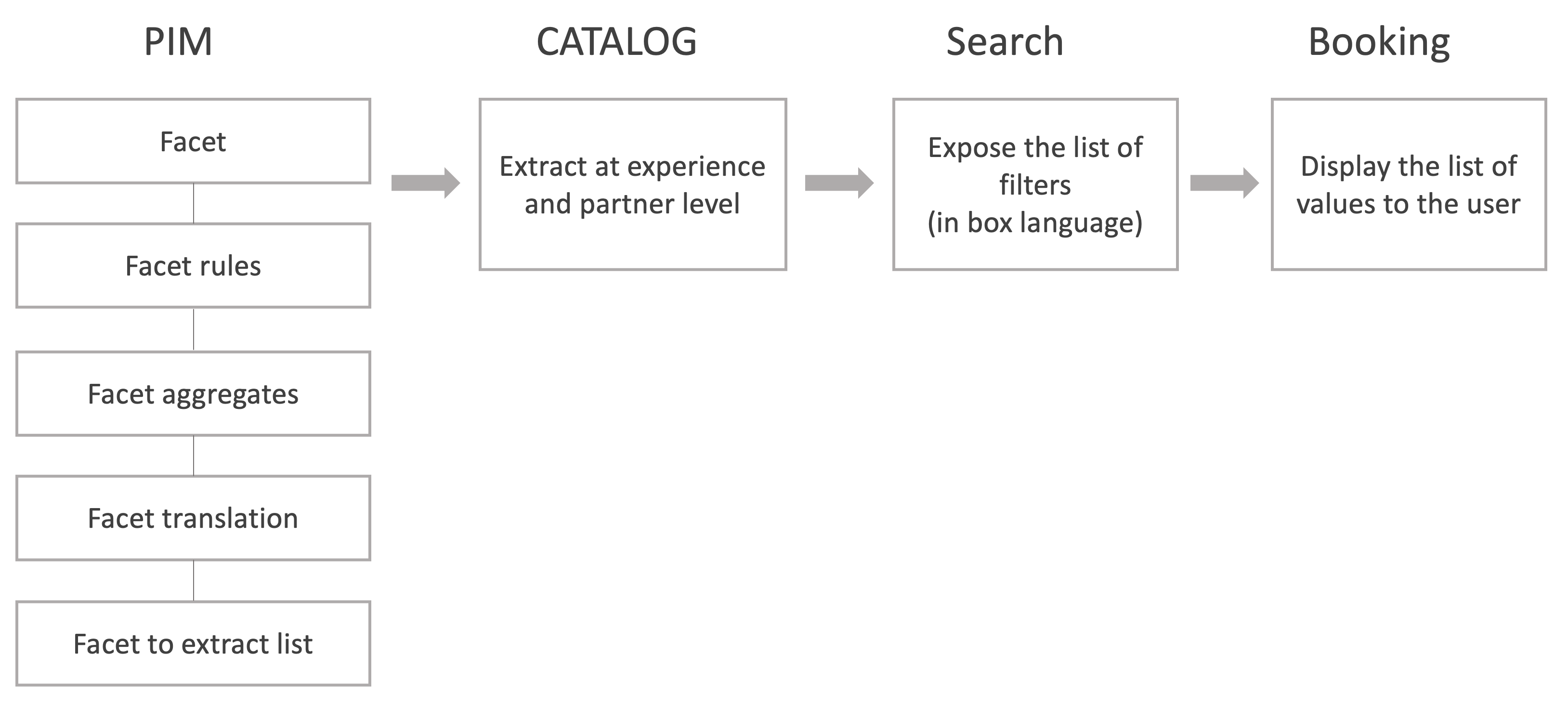 The diagram illustrates the flow from defining facets in PIM to displaying relevant values during booking, ensuring users can effortlessly find and book their desired experiences.