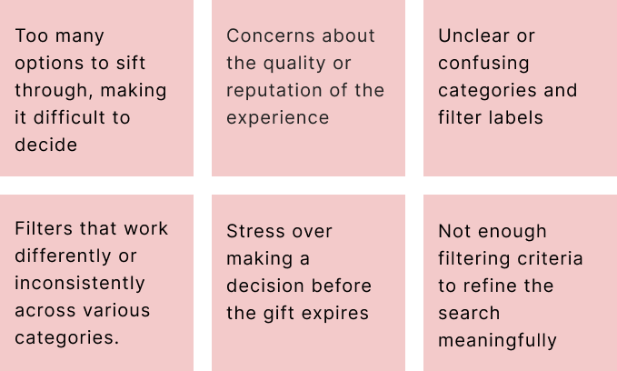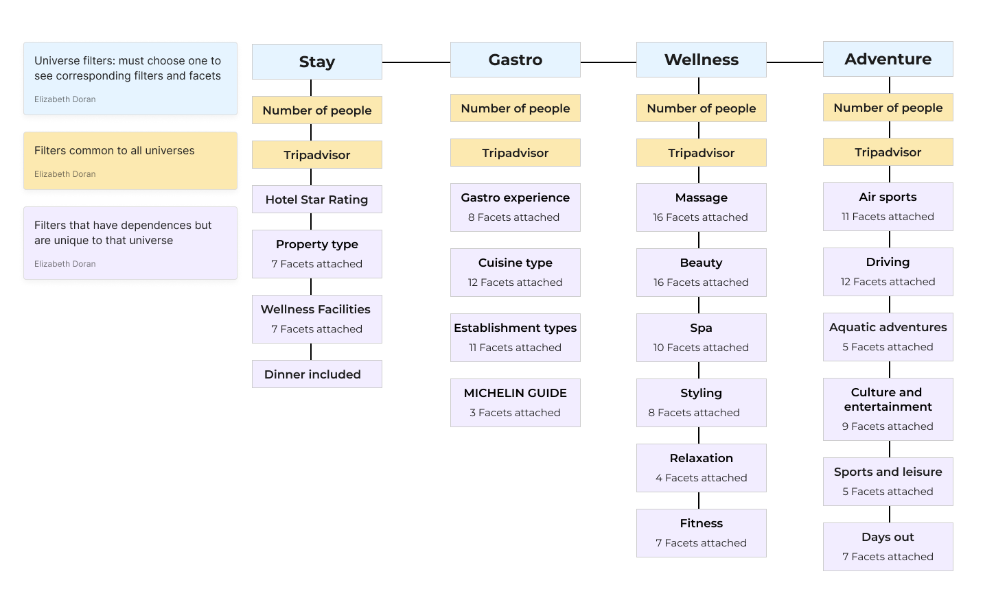 The Online Categories (filters & facets) project aims to enhance the user experience by helping recipients find and book experiences they will love. Currently, when a user receives a Smartbox for a stay experience, the description may indicate multiple venue types. However, upon entering the booking flow and reaching the search results page, users can only search by location or date. This limitation has led to user frustration, an increase in customer service calls, and a lower Net Promoter Score (NPS).