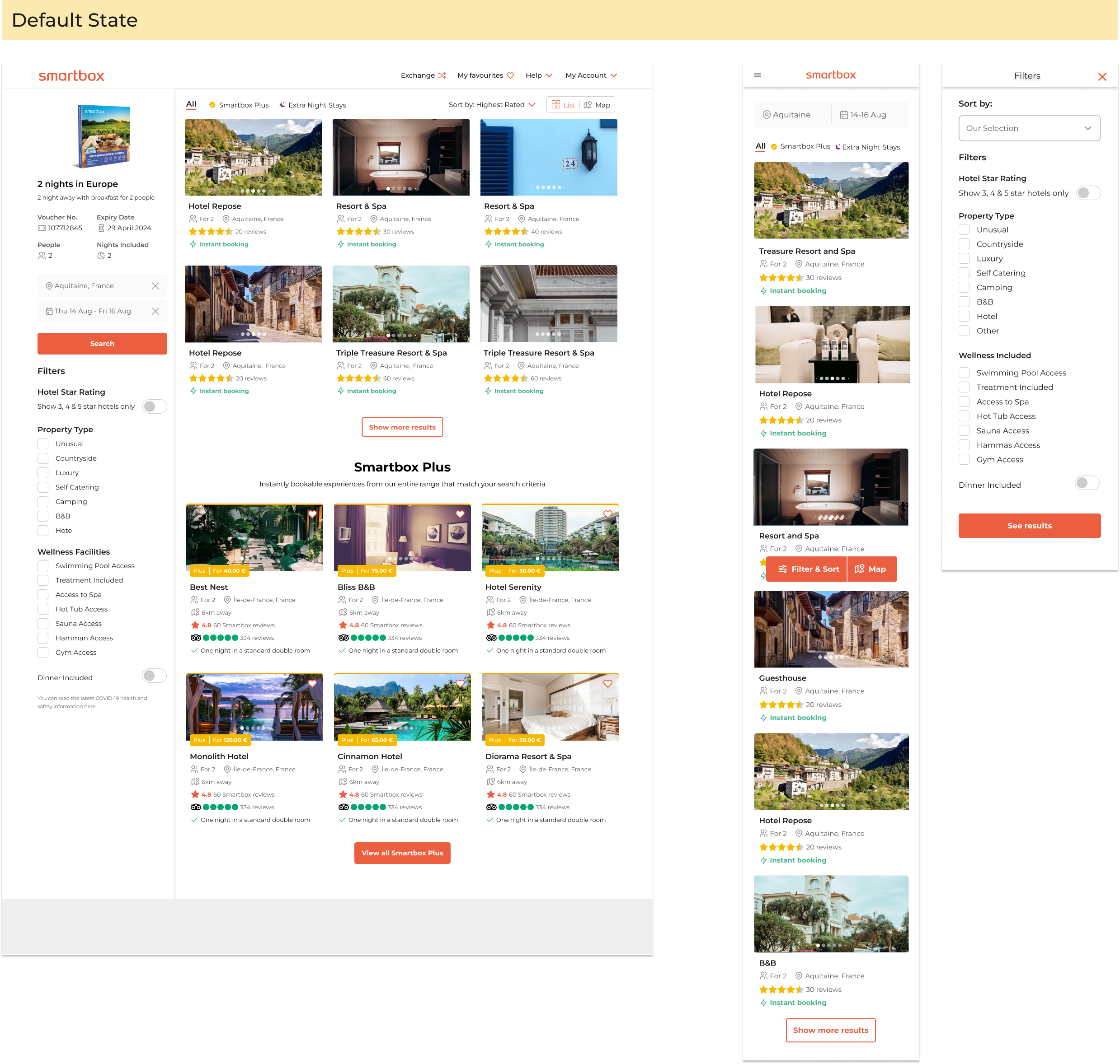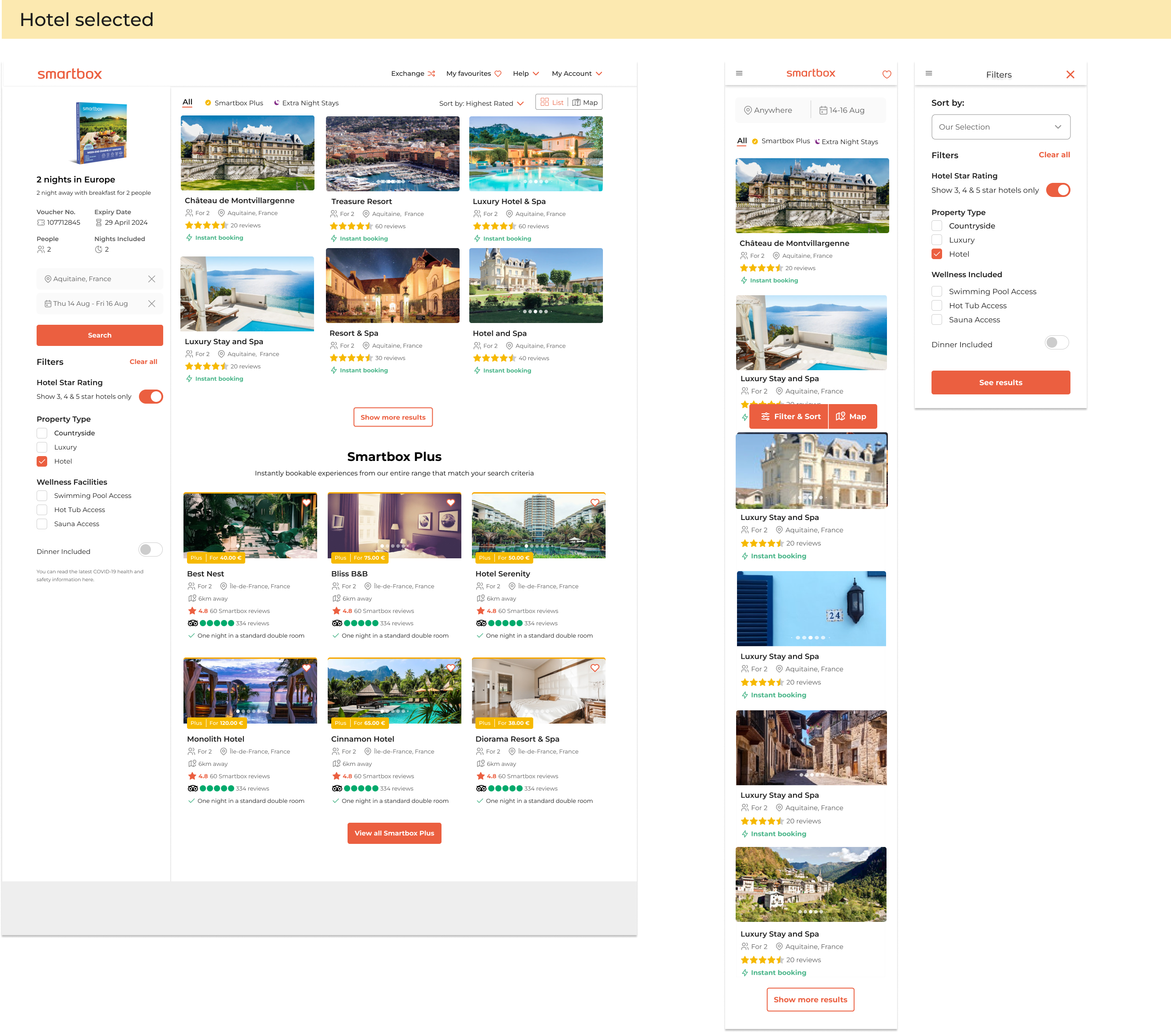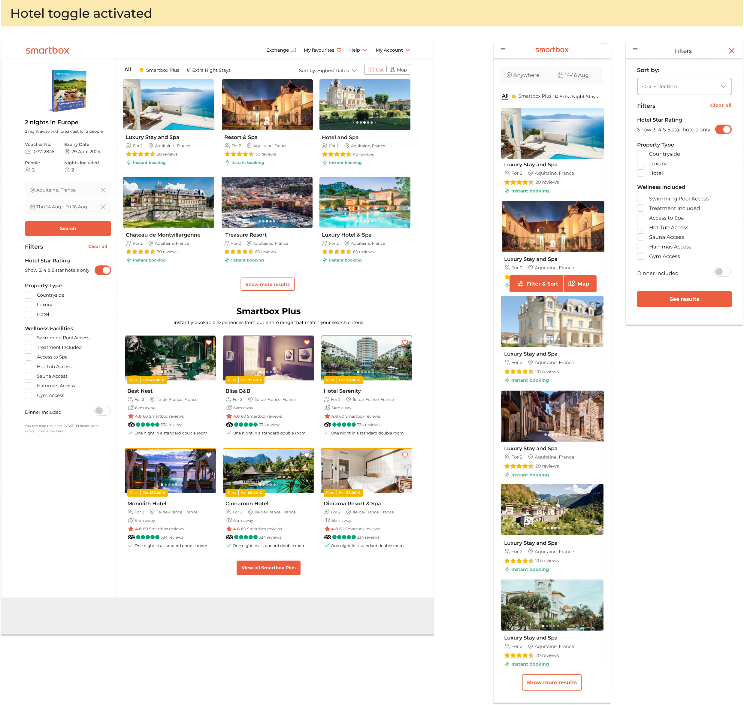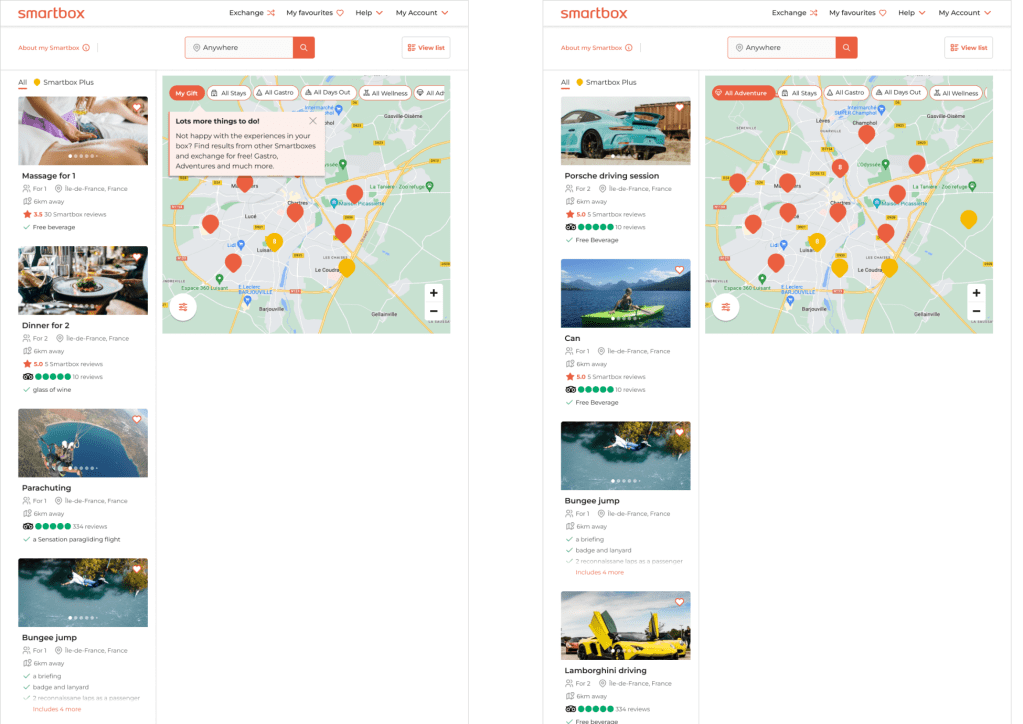 In the second phase of this project, we aimed to improve the user experience within Smartbox by introducing advanced filtering options for experiences and enabling users to browse the entire Smartbox portfolio.