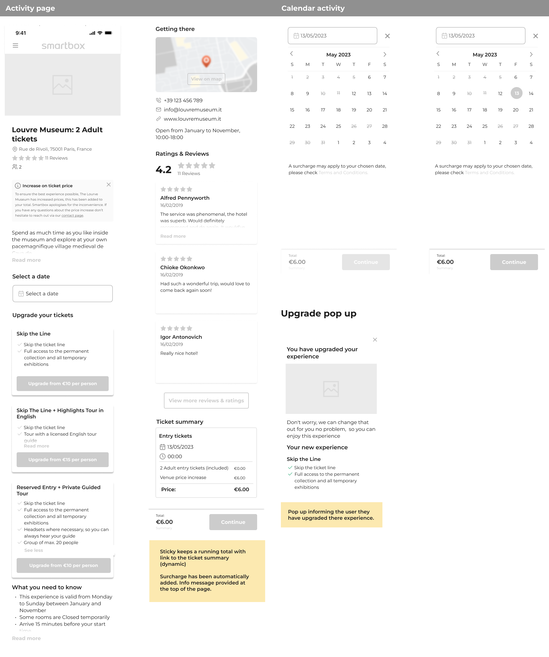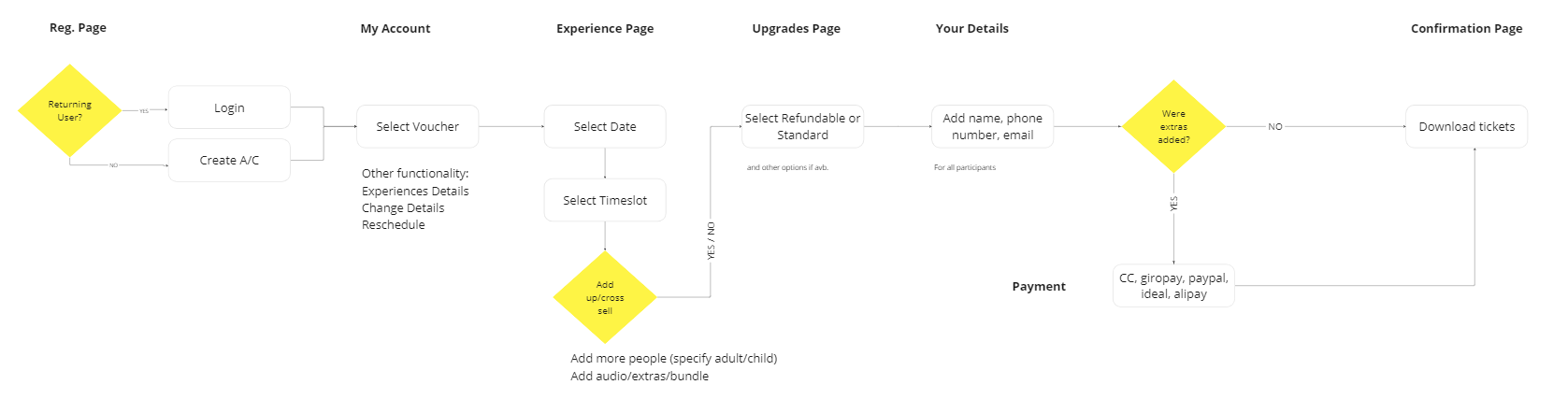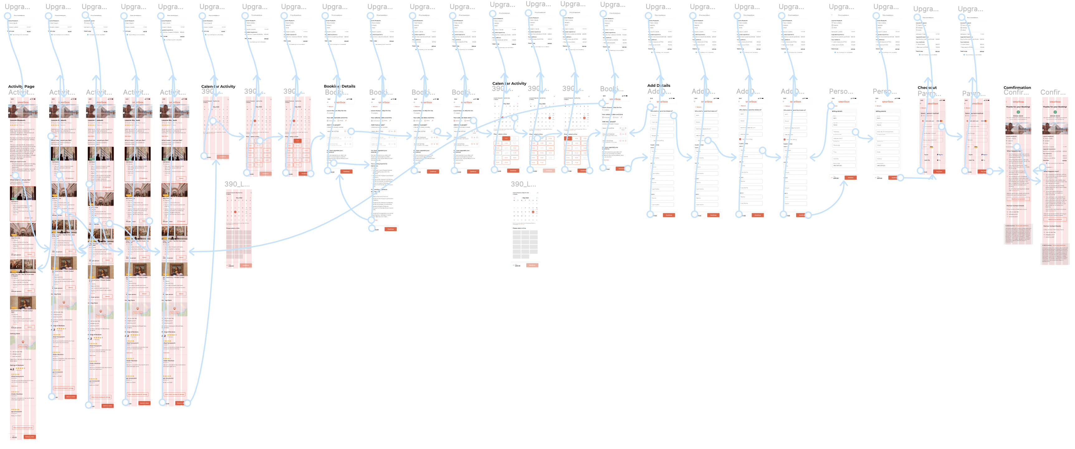The aim of this project was to bring the user from the activity details page to the confirmation page, enabling them to book a time and date while enticing them to upgrade along the way. So, based on internal research and competitor bench marking, I created the ideal flow.