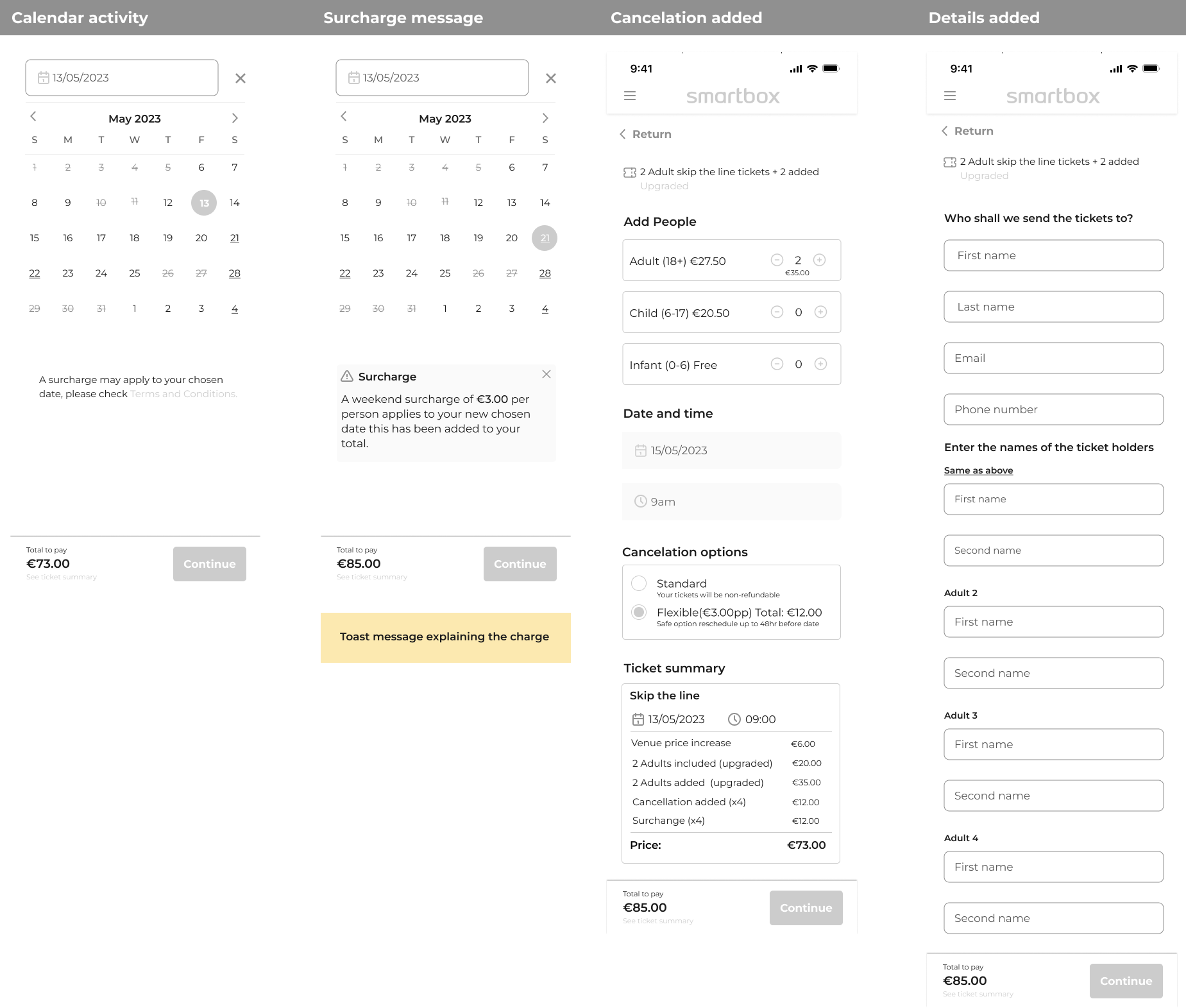 This prototype envisions the future of “Days Out,” demonstrating a seamless flow where beneficiaries can easily upgrade their admission tickets, book a date and time, and add friends along the way.