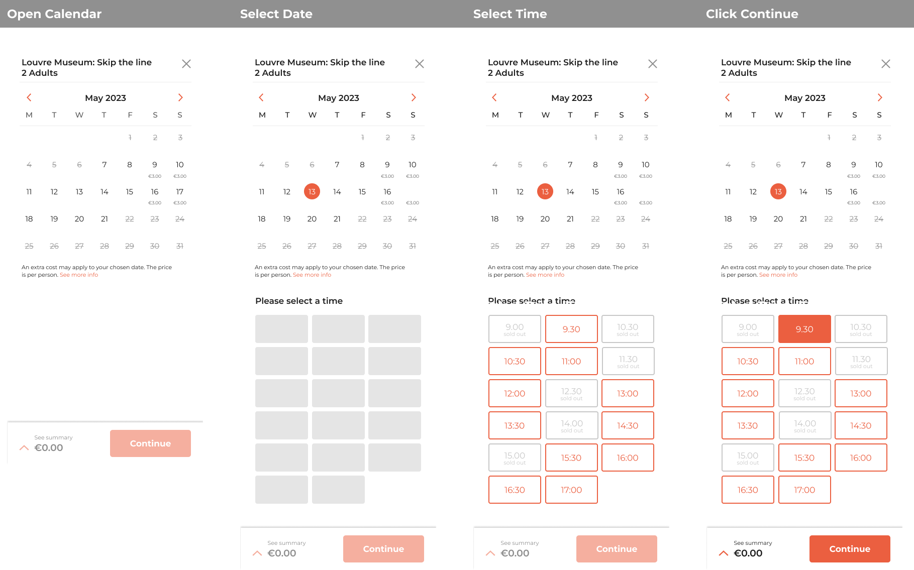 - Time slot availability: Show all time slots once a user selects a date. Display unavailable time slots at 50% opacity with a “sold out” label.