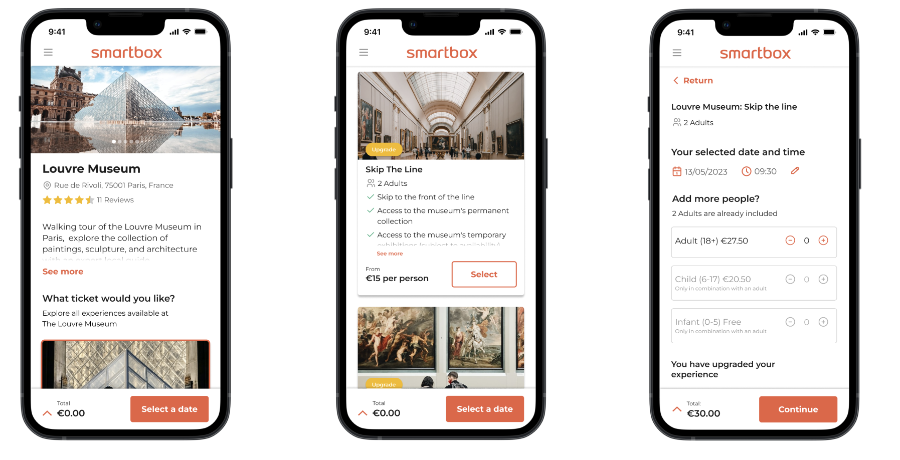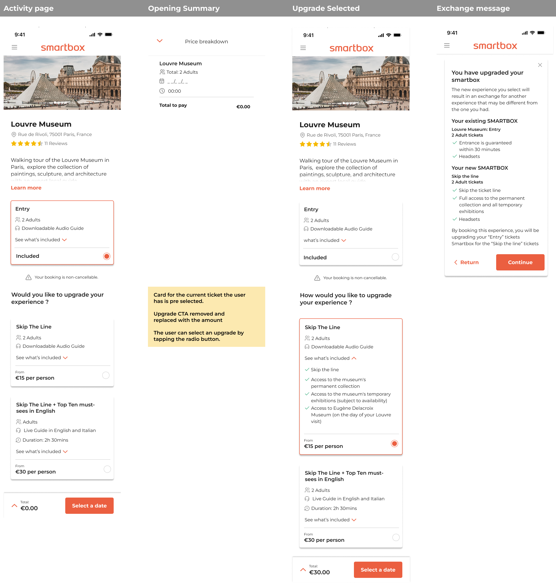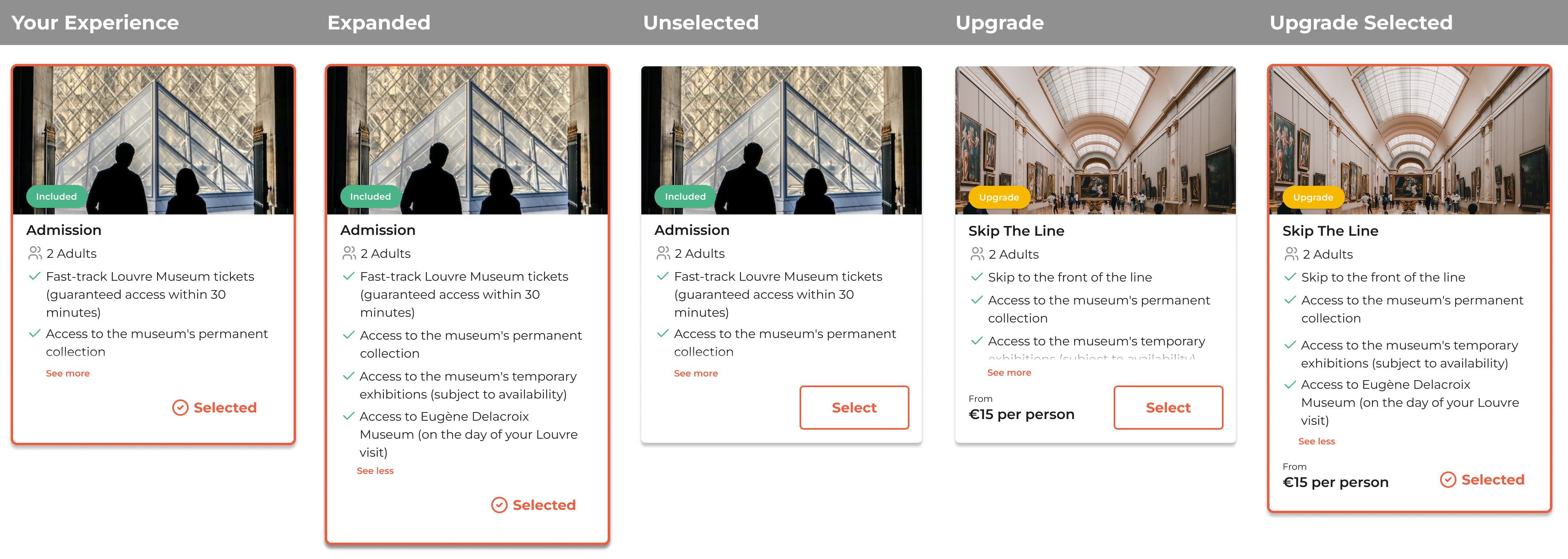 - Create a first experience above upgrade options and show it as selected, e.g., Louvre Museum: Entry for 2 Adults.