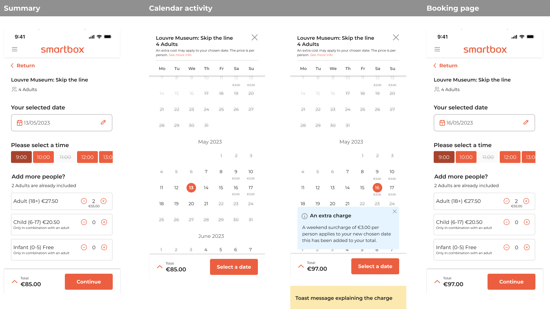 - Add surcharges on calendar with clear messaging: Display surcharges directly on the calendar and include clear, concise messaging to ensure users understand any additional costs.
