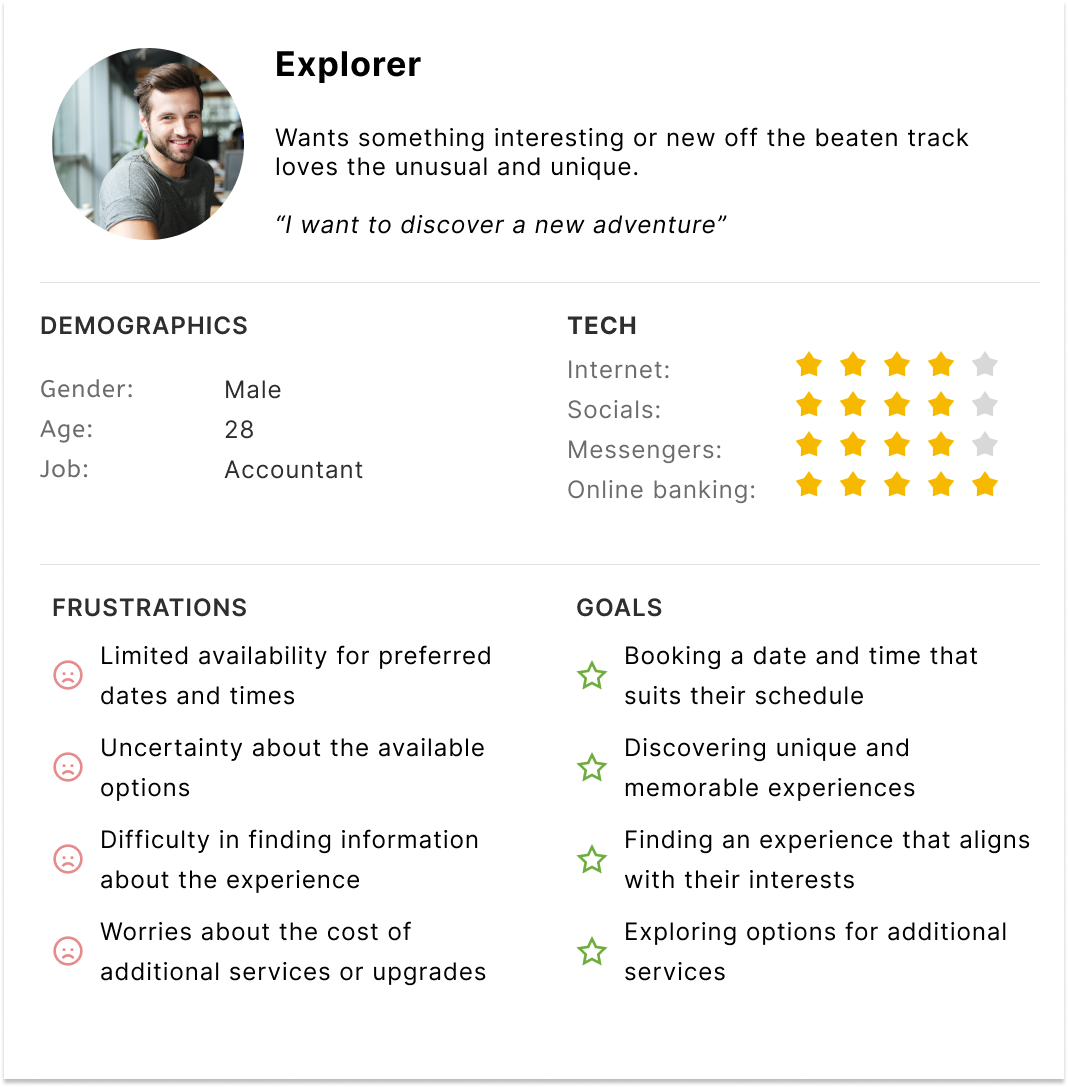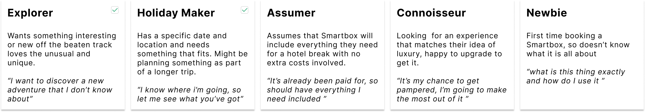 I operate on the premise that there are five distinct persona types, and for this project, I focused in-depth on two of them.