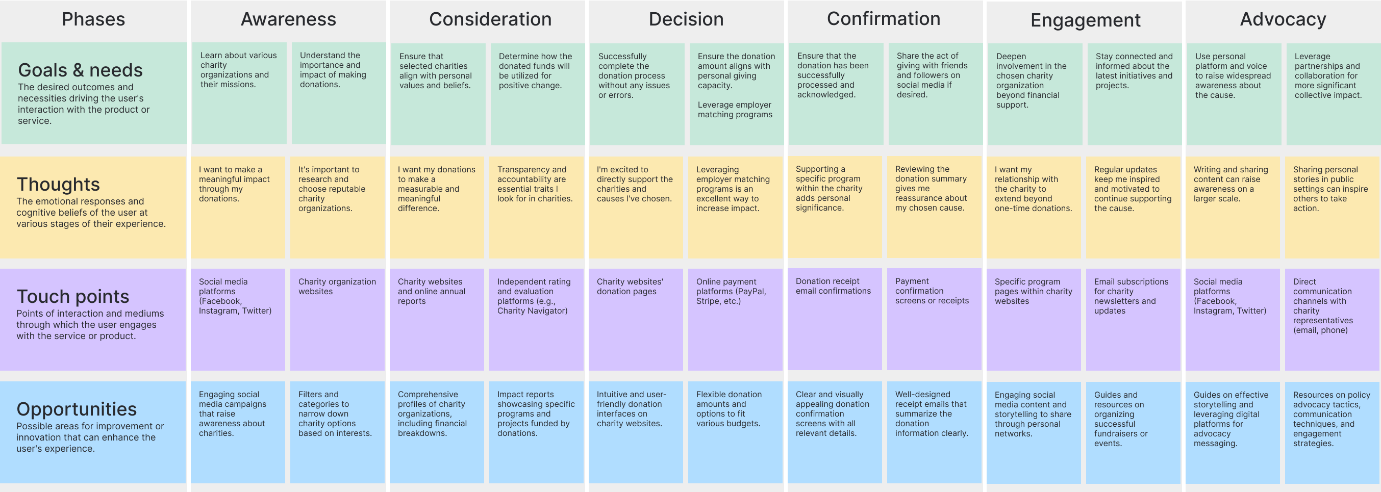 Creating a donor journey was an essential step for me to see how to guide potential supporters through a meaningful and engaging experience. By mapping out the steps a donor might take from initial awareness to becoming a dedicated contributor, I can better understand their motivations, concerns, and needs at each stage. This insight will enable me to tailor the website’s content, design, and functionality to effectively address these factors, fostering trust, connection, and ultimately, encouraging action.