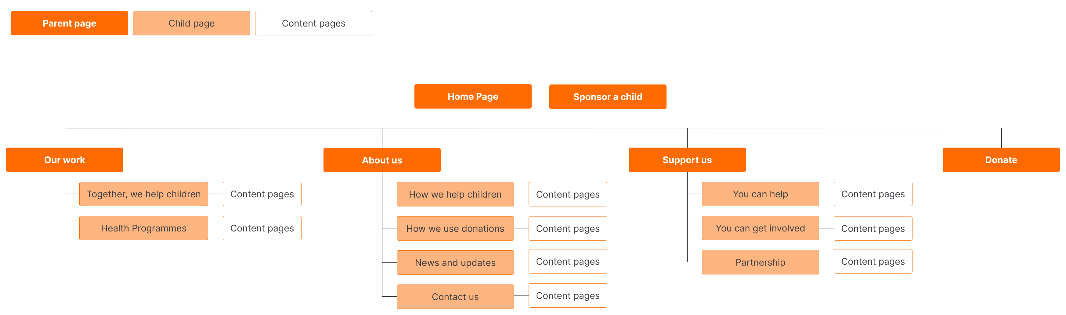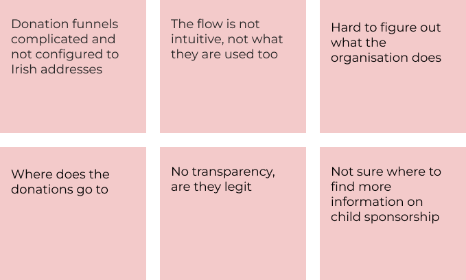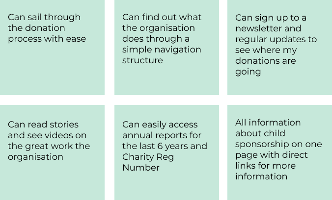 An extensive competitor analysis was conducted with 2 organisations directly related to child sponsorship: plan.ie and actionaid.ie, as well as one of the biggest NGO’s in Ireland Concern.net. I looked at how they told the story of the organisation, the donation process, information structure, navigation, layout, tone, and overall content.