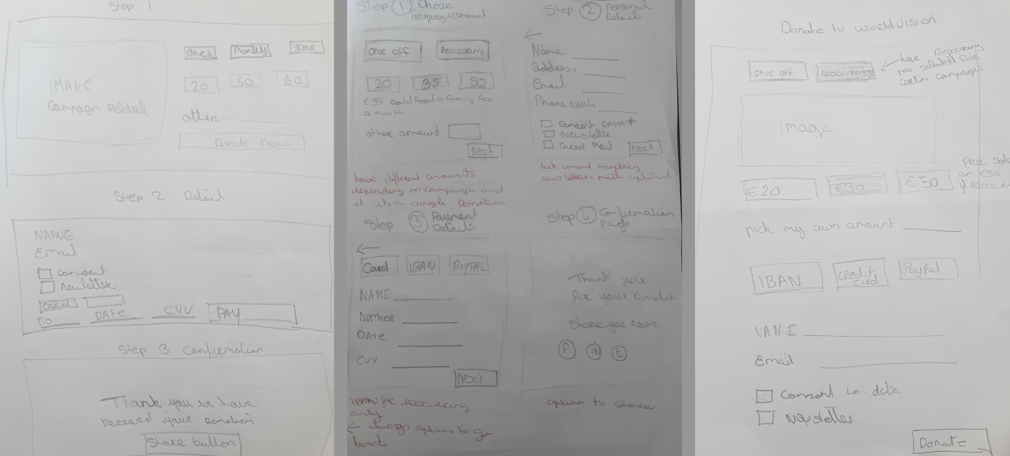 Time to sketch! At this stage, we’ve mapped out and tested the Information Architecture (IA) to find the most effective route to guide users to the donation page. Myself and two other World Vision Ireland staff members started sketching at a broad level, drawing inspiration from the competitor analysis we conducted. This stage is truly exciting because innovative ideas naturally emerge, bridging the gap to the next stage of wireframes.